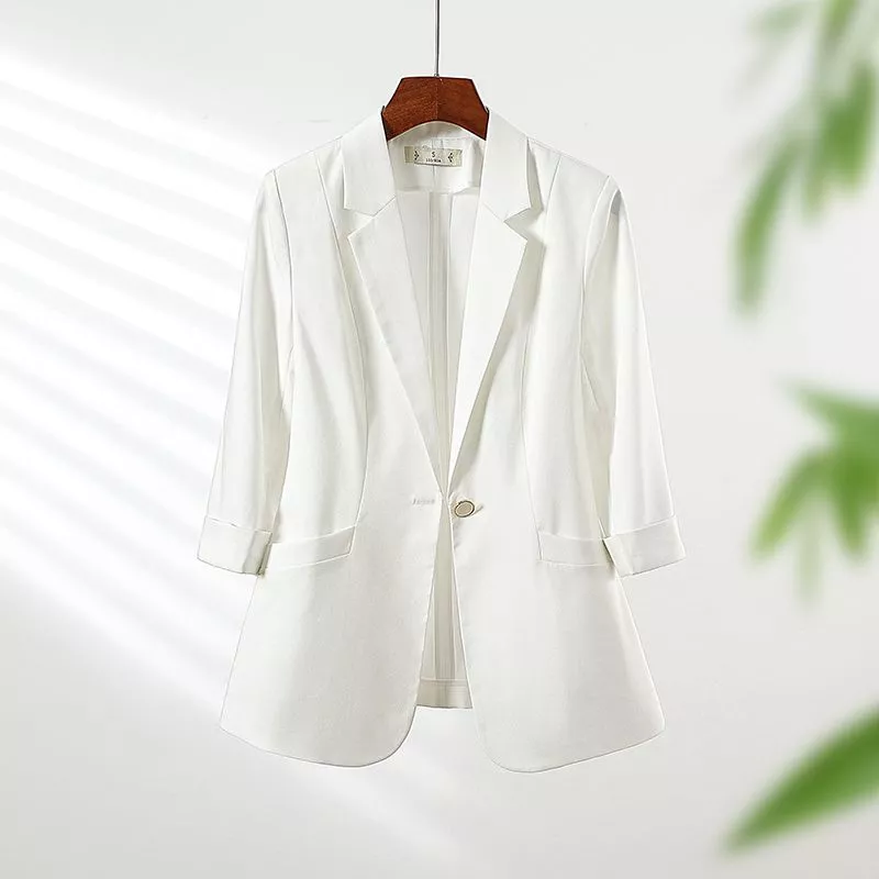 Giacca blazer da donna dal taglio slim fit elegante, ideale per outfit business e chic durante la stagione primavera/estate. Il design con mezza manica e bottoncino dorato dona un tocco raffinato, perfetto sia per l'ufficio che per eventi formali. Grazie alla linea aderente, valorizza la silhouette mantenendo comfort e freschezza. Le tasche anteriori aggiungono praticità, mentre il design minimal si abbina facilmente a pantaloni palazzo, gonne o jeans per creare look versatili e sempre sofisticati.