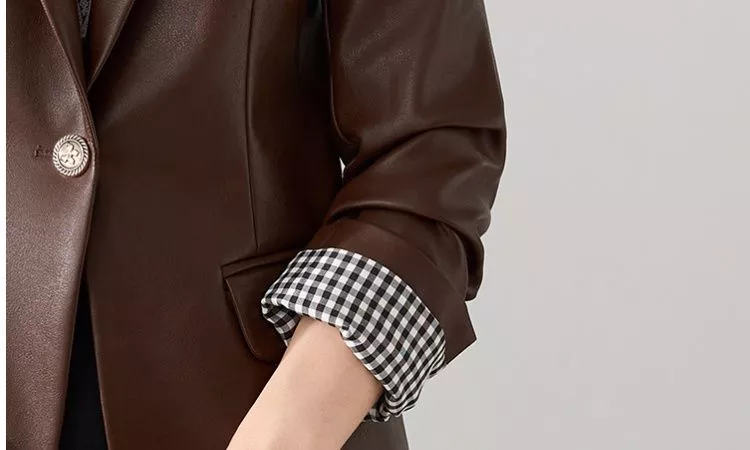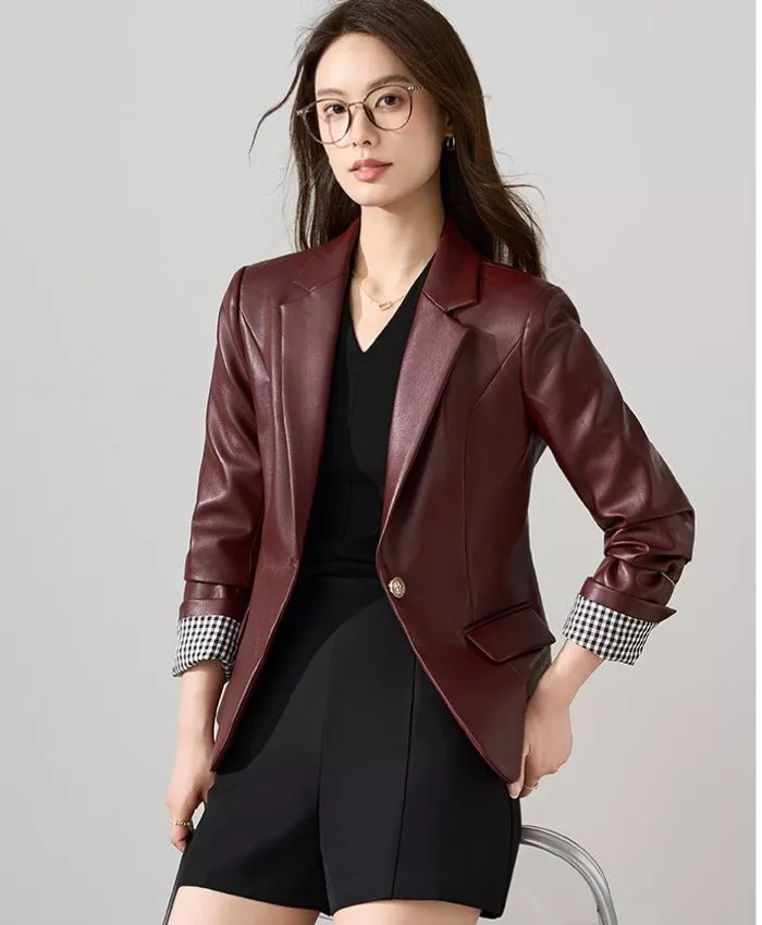 Blazer da donna elegante in similpelle, ideale per completare outfit formali e look da ufficio. Il design monopetto con bottone singolo dorato esalta la linea slim fit, mentre la fodera interna a quadri aggiunge un dettaglio ricercato e moderno. Un capo versatile e raffinato, perfetto da indossare con pantaloni sartoriali o gonne per cerimonie, eventi e serate di lavoro.