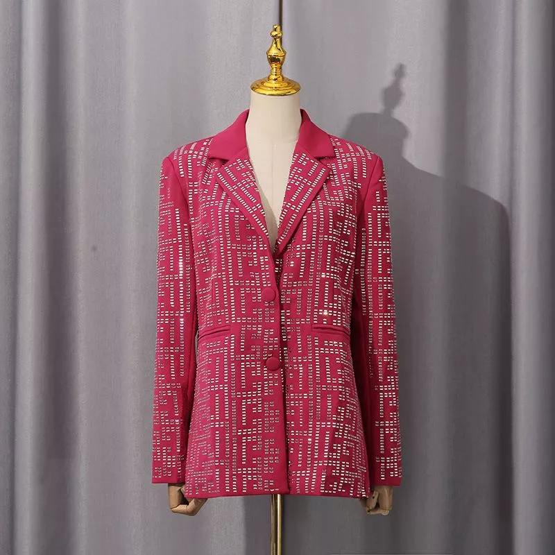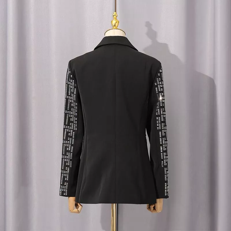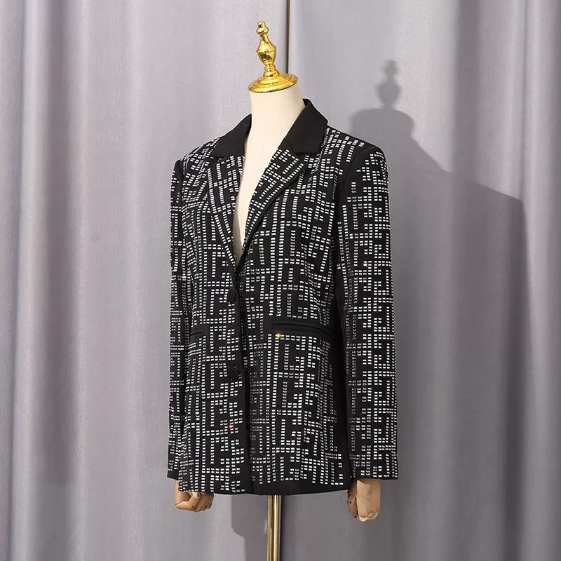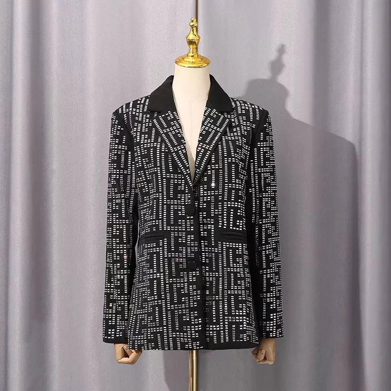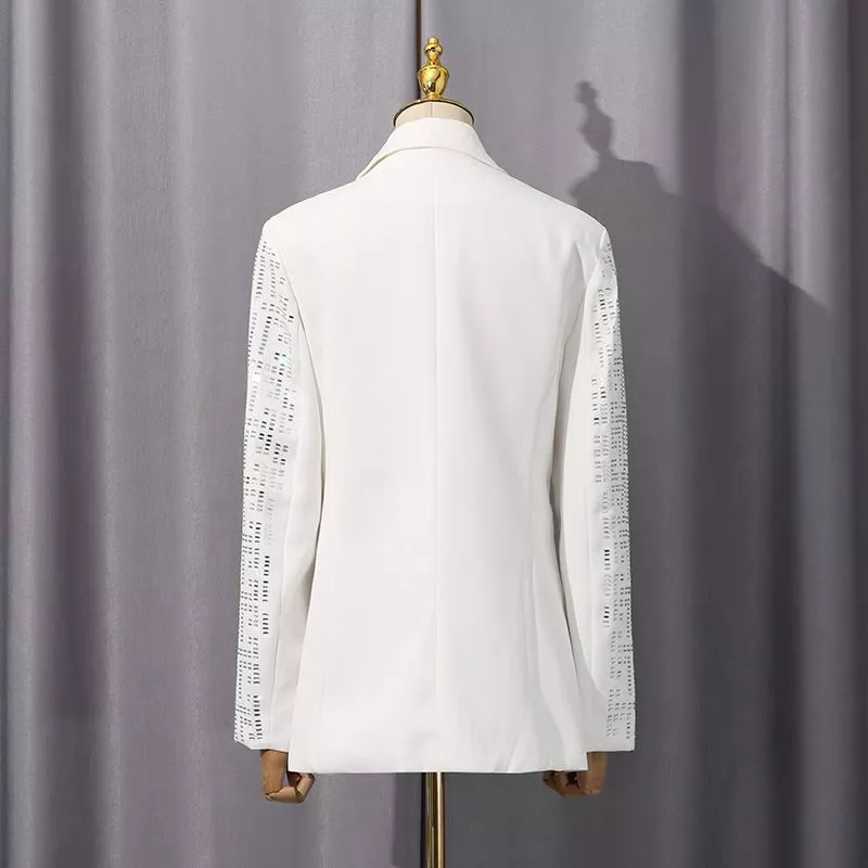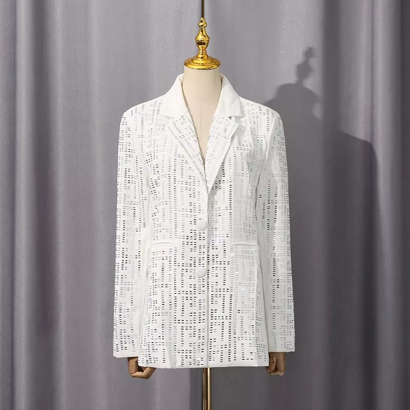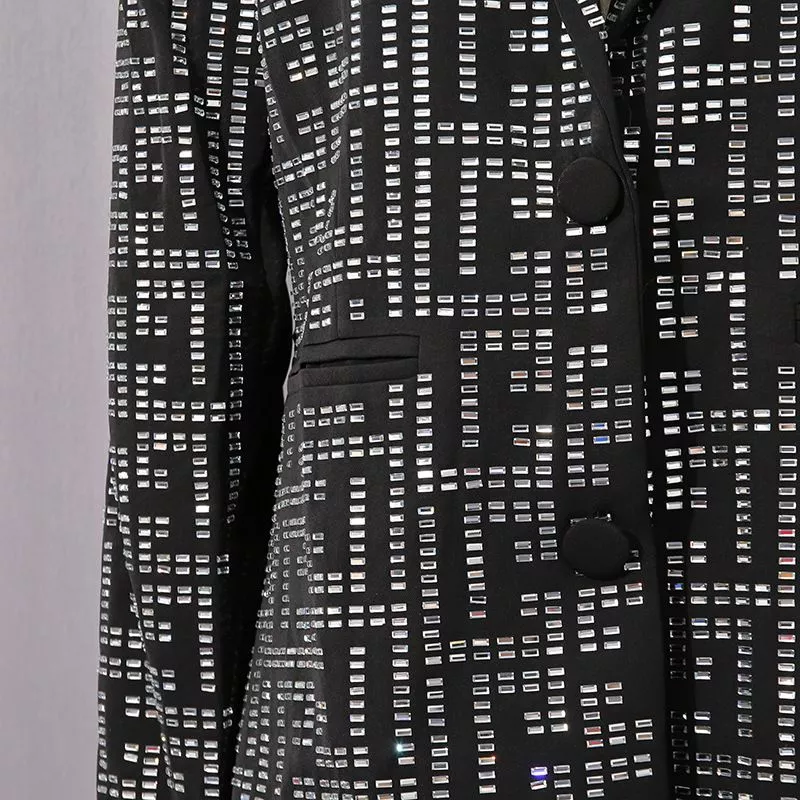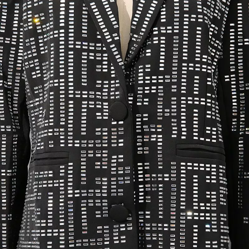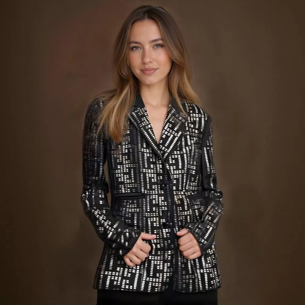 Blazer luminoso con motivo geometrico riflettente, perfetto per chi desidera distinguersi con stile. Il taglio leggermente sfiancato e i bottoni rivestiti creano una silhouette raffinata, mentre il tessuto strutturato con effetto luce dona eleganza e modernità.