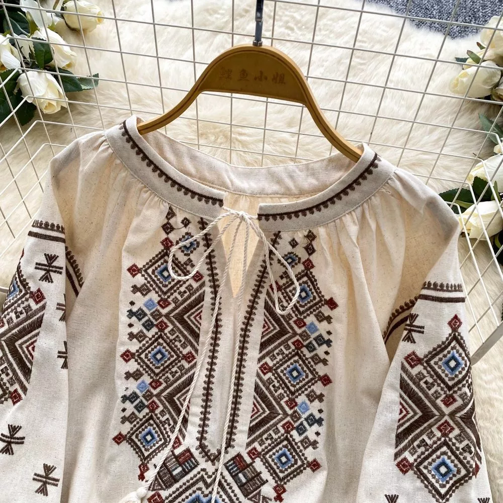 Una blusa ricamata che unisce eleganza e comfort, caratterizzata da motivi geometrici curati e maniche ampie che aggiungono movimento al look. Il tessuto morbido valorizza la linea senza segnare, mentre il dettaglio con cordoncino sul davanti dona un tocco raffinato e naturale. Perfetta per outfit casual chic, abbinata a denim, pantaloni larghi o gonne fluide. Ideale per il tempo libero, per il lavoro o per creare look femminili e moderni con un carattere ricercato.