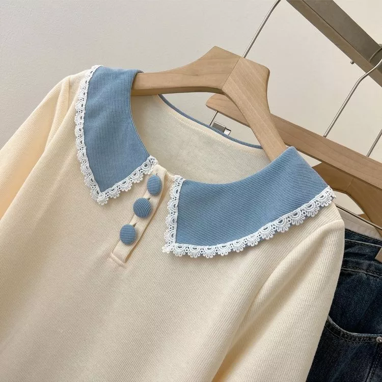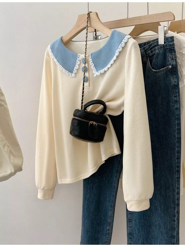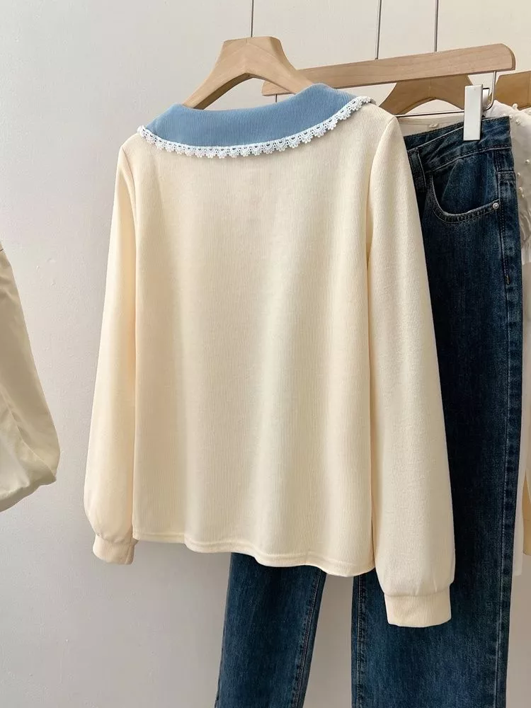 Blusa elegante con base chiara e colletto a contrasto azzurro rifinito in pizzo bianco. I bottoni decorativi frontali e le maniche lunghe con polsino leggero la rendono un capo femminile e ricercato. Realizzata in tessuto sintetico morbido e confortevole, è ideale per chi desidera uno stile romantico ma versatile, perfetto per l’ufficio o per occasioni casual chic.