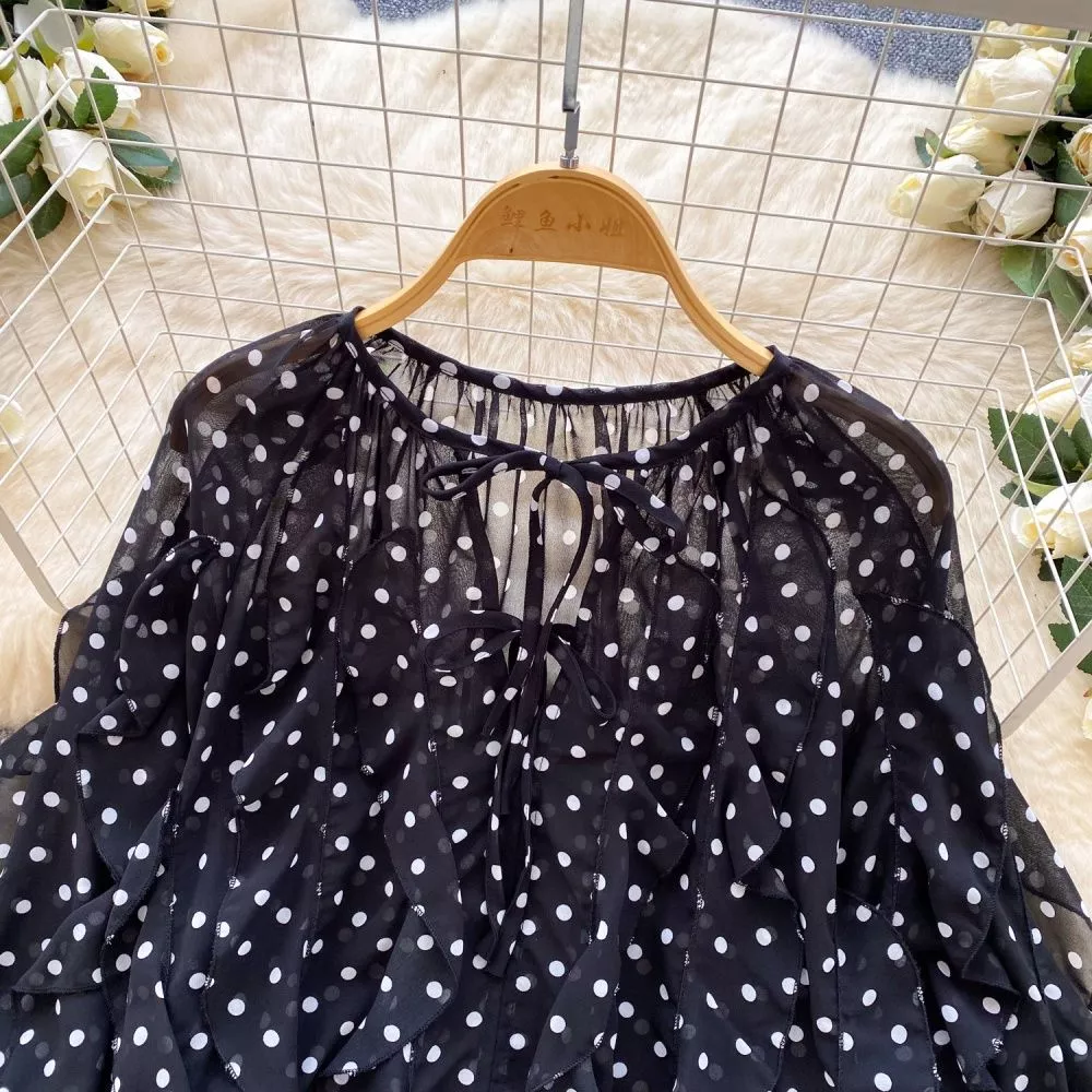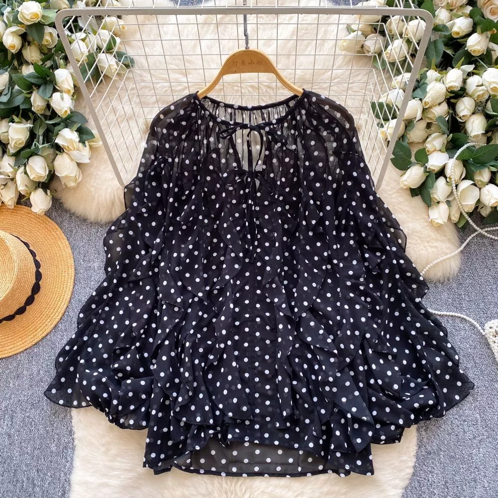 Blusa Donna Nero Pois Con Rouches Romantica Ampia CF67614