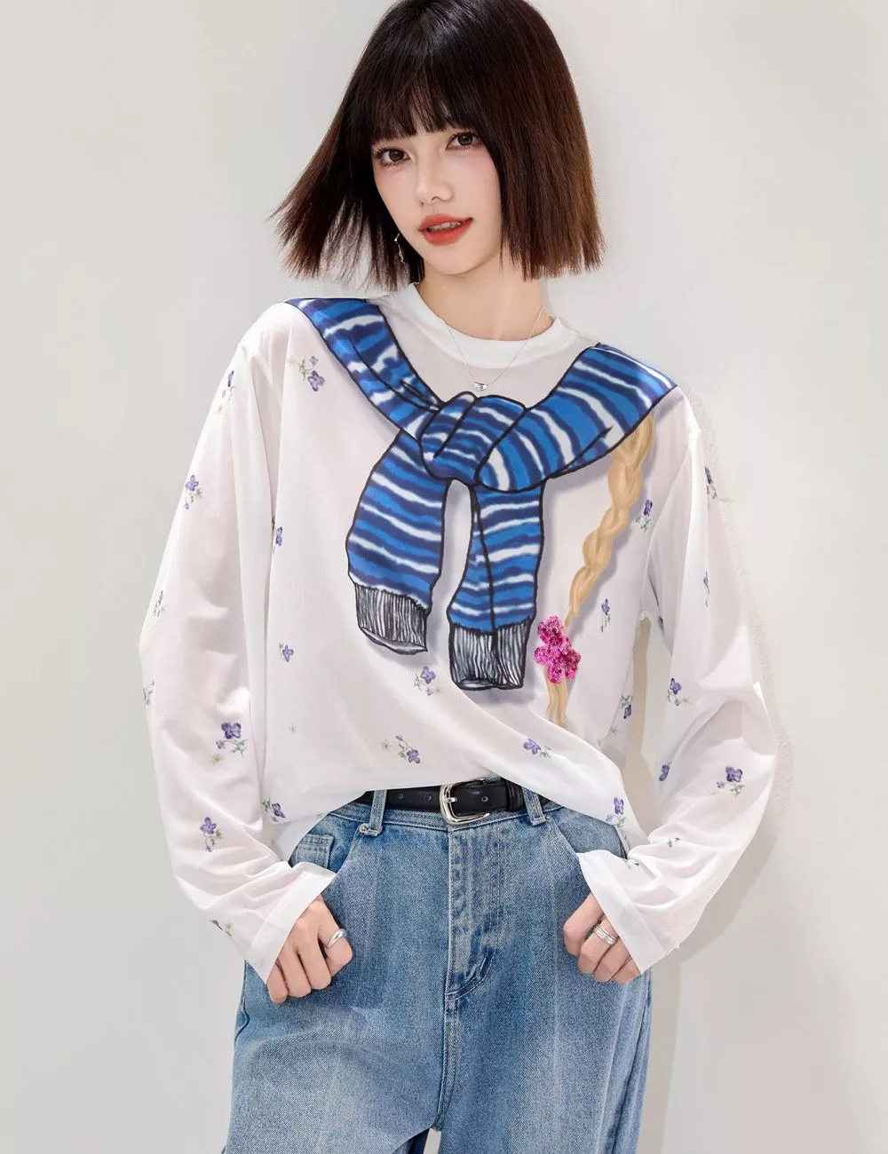 Blusa leggera dal design originale con stampa floreale e grafica decorativa frontale. Il taglio morbido e la linea casual chic la rendono perfetta per outfit quotidiani e look rilassati ma curati.