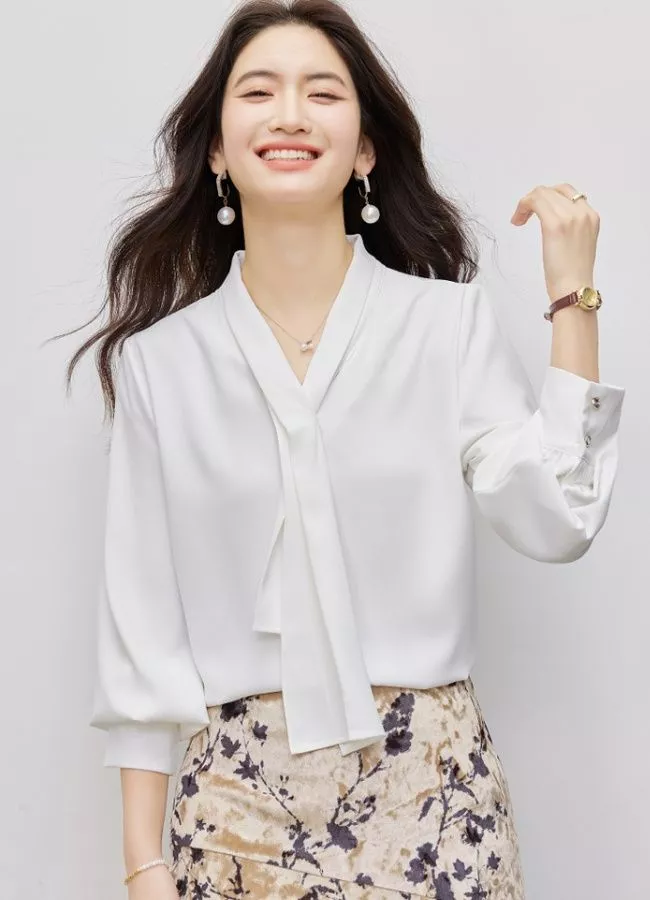 Blusa donna elegante e versatile perfetta per look professionali e outfit raffinati. Il tessuto sintetico fluido valorizza la vestibilità morbida mentre lo scollo a V con fiocco lungo dona un tocco femminile e sofisticato. Ideale per ufficio, eventi e occasioni eleganti, si abbina facilmente a pantaloni sartoriali o gonne per un look chic e moderno.
