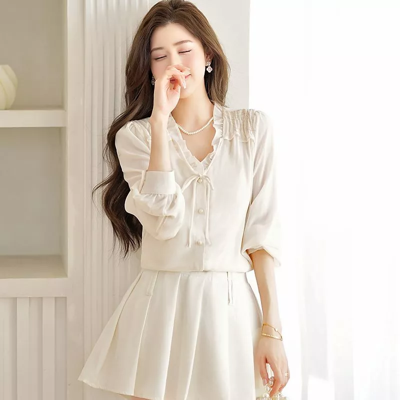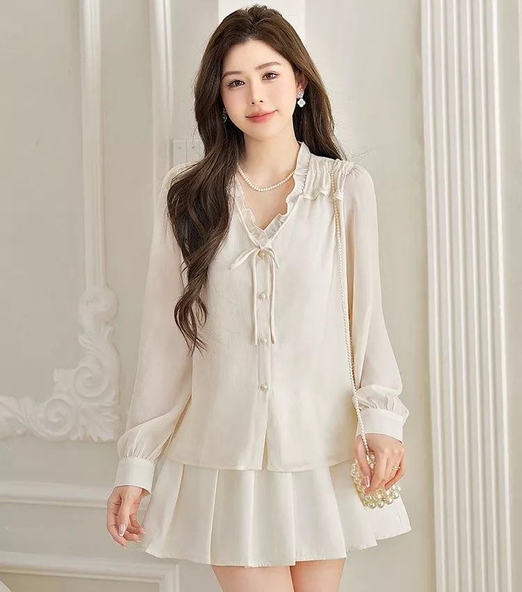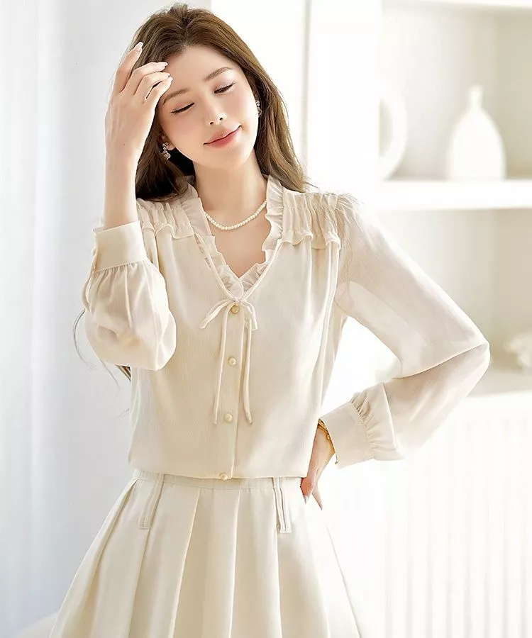 Blusa Elegante Donna Collo Arricciato Con Fiocco Ufficio Chic Albicocca CF67256