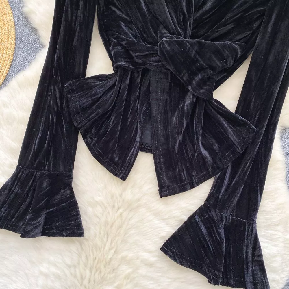 Blusa Velluto Elegante Nodo Centrale Nero Maniche Tromba Look Chic Sera CF60337