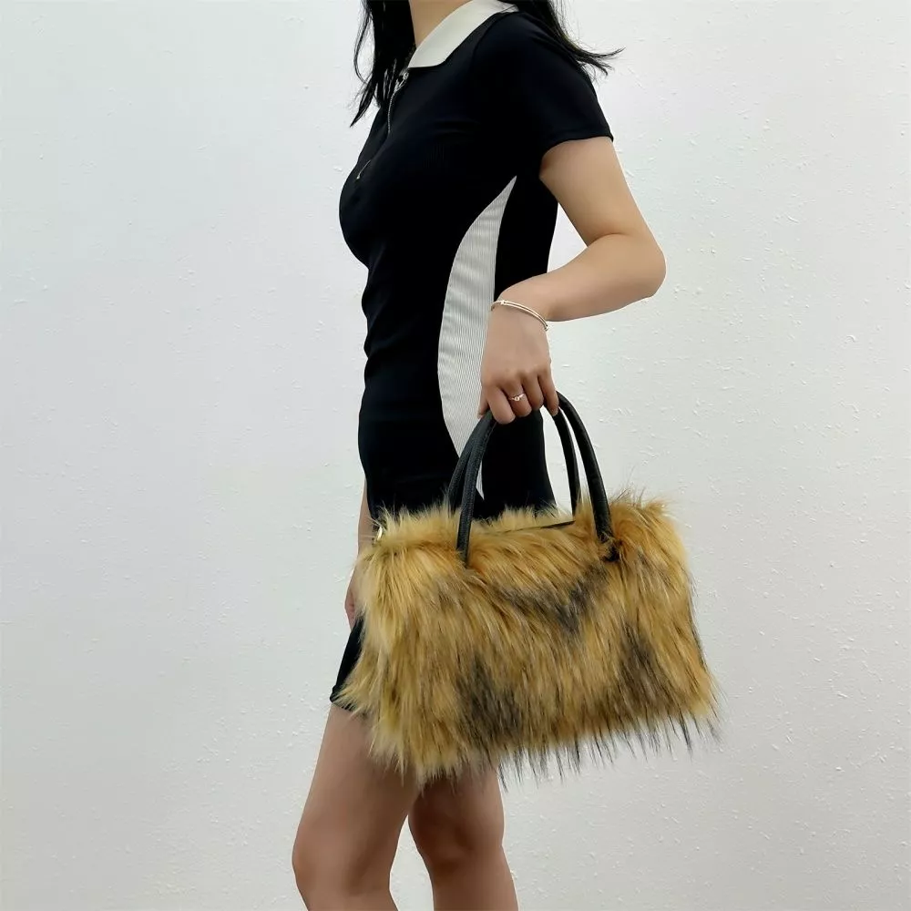 Borsa donna in eco pelliccia effetto volpe dal design glamour e contemporaneo, perfetta per completare look invernali eleganti e outfit da sera d'impatto. La texture morbida e voluminosa rende questa borsa un vero accessorio statement, capace di valorizzare anche gli abbinamenti più minimal.