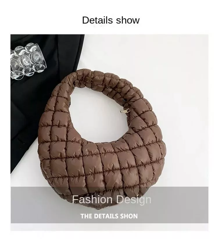 Borsa donna dallo stile contemporaneo con lavorazione trapuntata effetto piuma e forma a mezza luna.