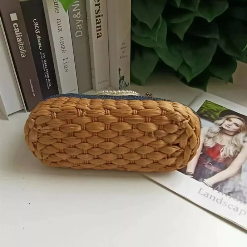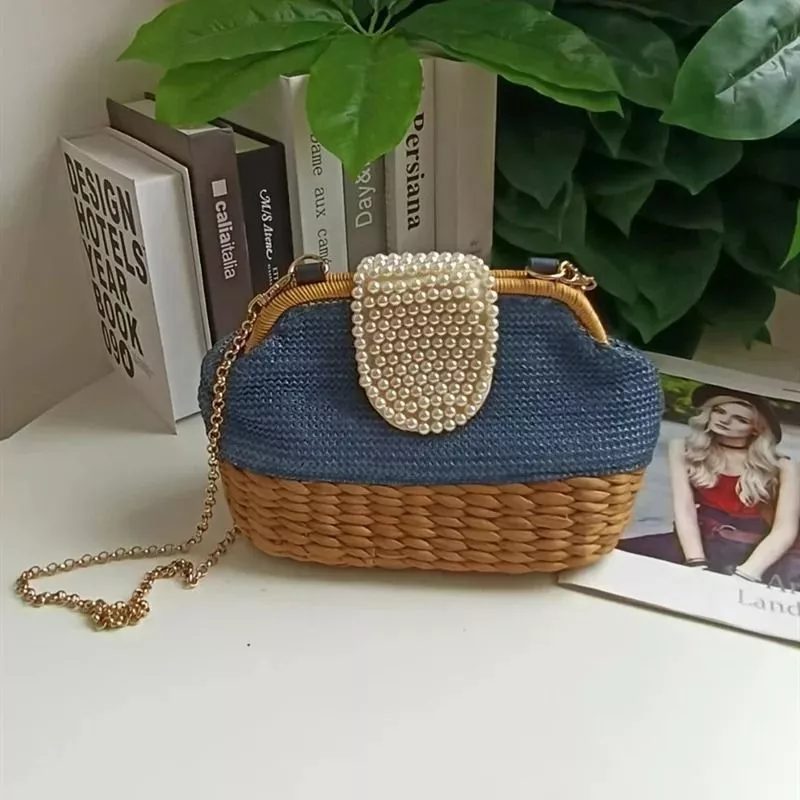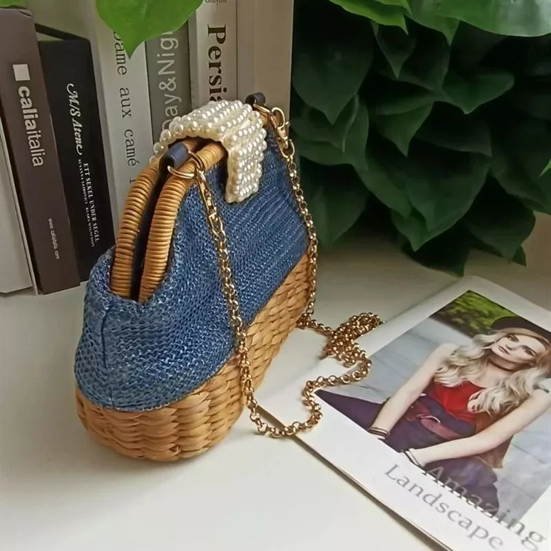 Borsa Elegante Intreccio Paglia Blu Perle Beige Manico Rigido Catena CF7K9P2