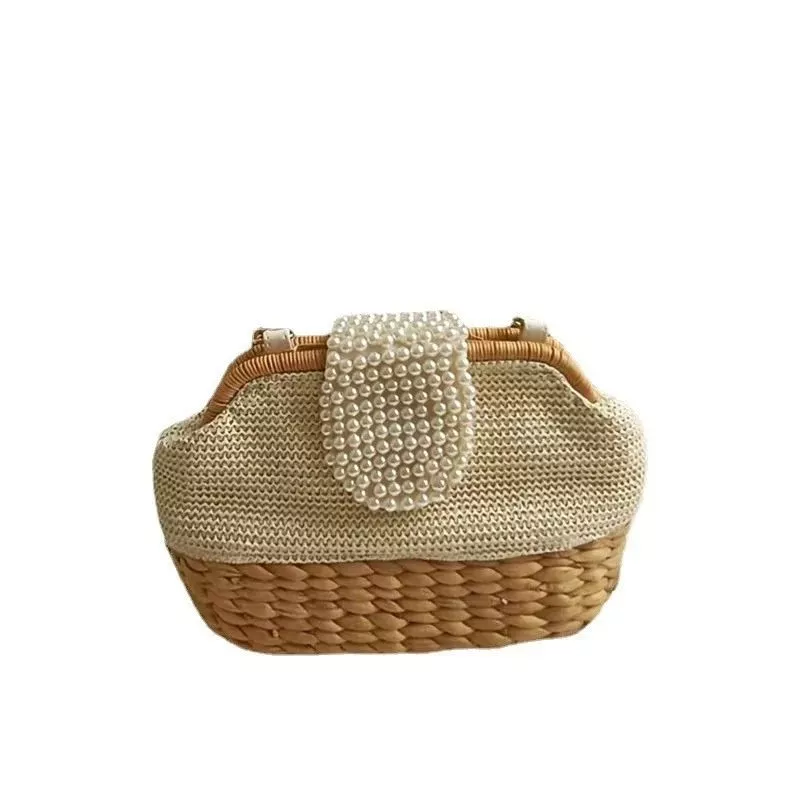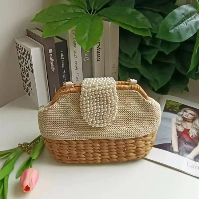 Borsa elegante con struttura compatta caratterizzata da un raffinato intreccio effetto paglia e dettaglio frontale decorato con perle applicate che donano un tocco luminoso e sofisticato. Il manico rigido superiore valorizza la forma, mentre la catena consente un utilizzo versatile anche a spalla. Ideale per completare look ricercati con un accessorio distintivo e femminile.