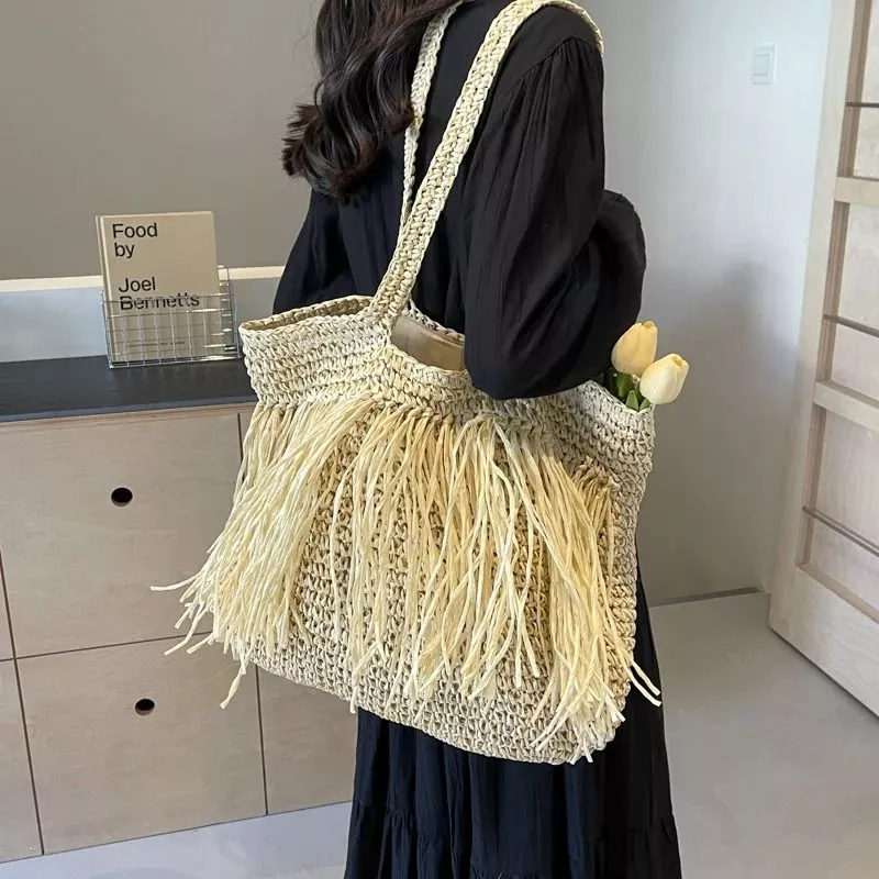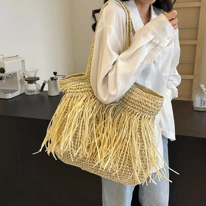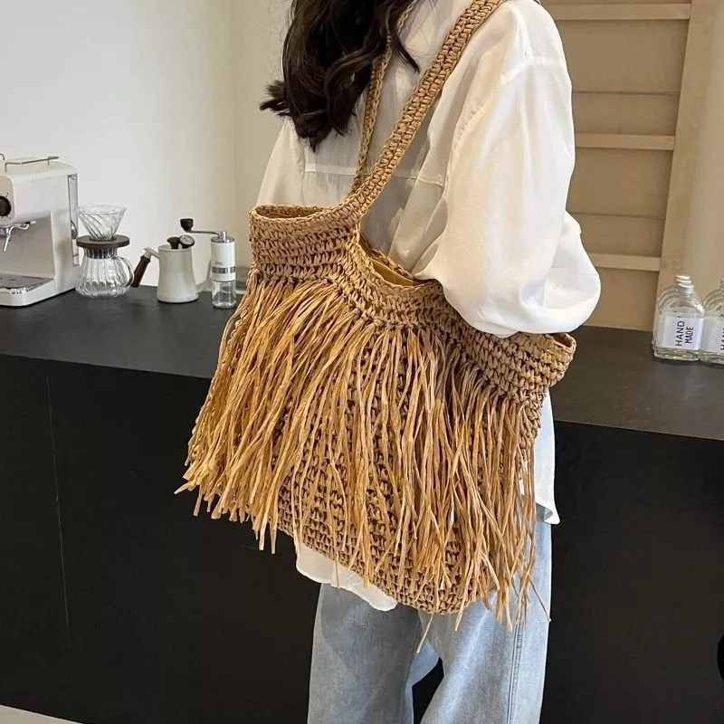 Borsa shopper in intreccio effetto paglia con frange decorative a tutta lunghezza, progettata per un impatto visivo deciso in stile boho estivo. La struttura ampia consente una buona capacità interna, mentre i manici lunghi permettono un utilizzo comodo a spalla. Le frange aumentano il movimento visivo e rendono il prodotto più distintivo rispetto alle shopper classiche, ma richiedono maggiore attenzione nell’uso quotidiano per evitare usura. Ideale per outfit casual, vacanze e contesti informali.