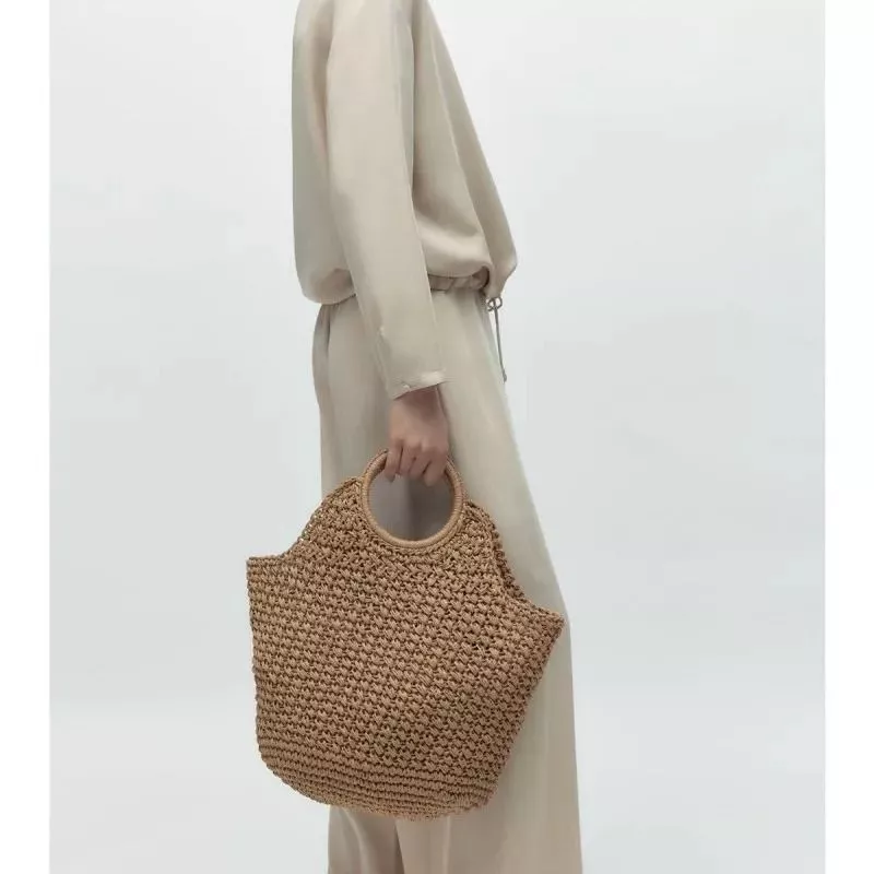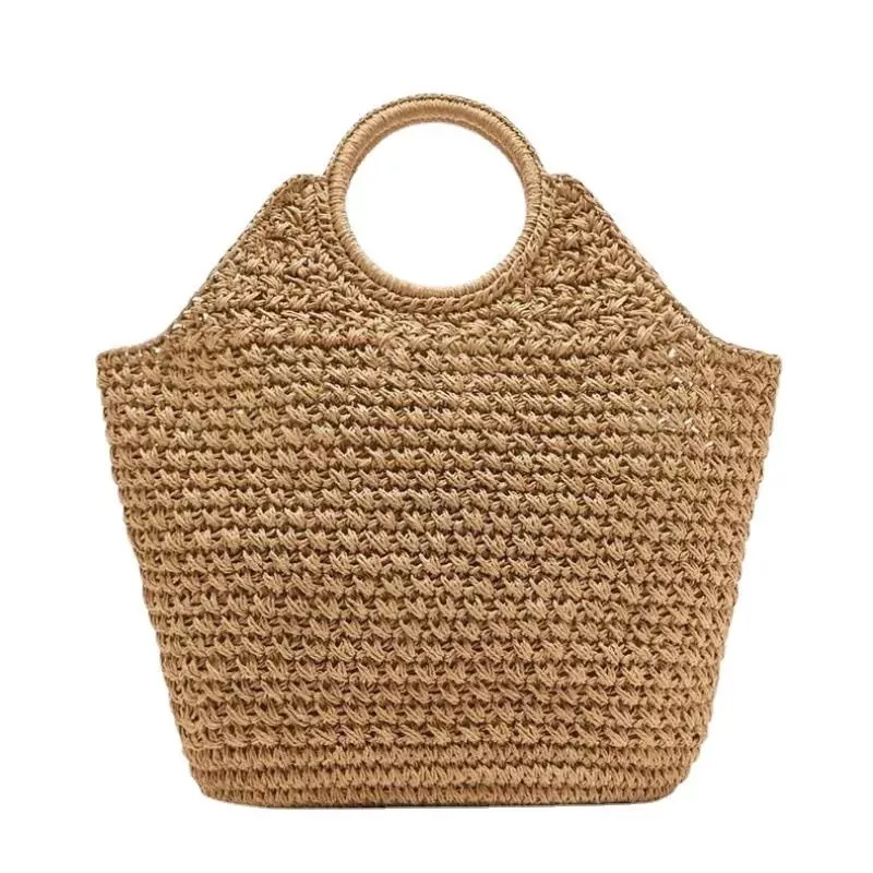 Borsa in paglia intrecciata dal design naturale e contemporaneo, caratterizzata da una lavorazione compatta e da un manico rigido circolare che ne valorizza lo stile. La forma ampia e funzionale permette di organizzare comodamente gli oggetti quotidiani, mantenendo un’estetica leggera e raffinata. Ideale per completare look estivi con un accessorio versatile e sempre attuale.