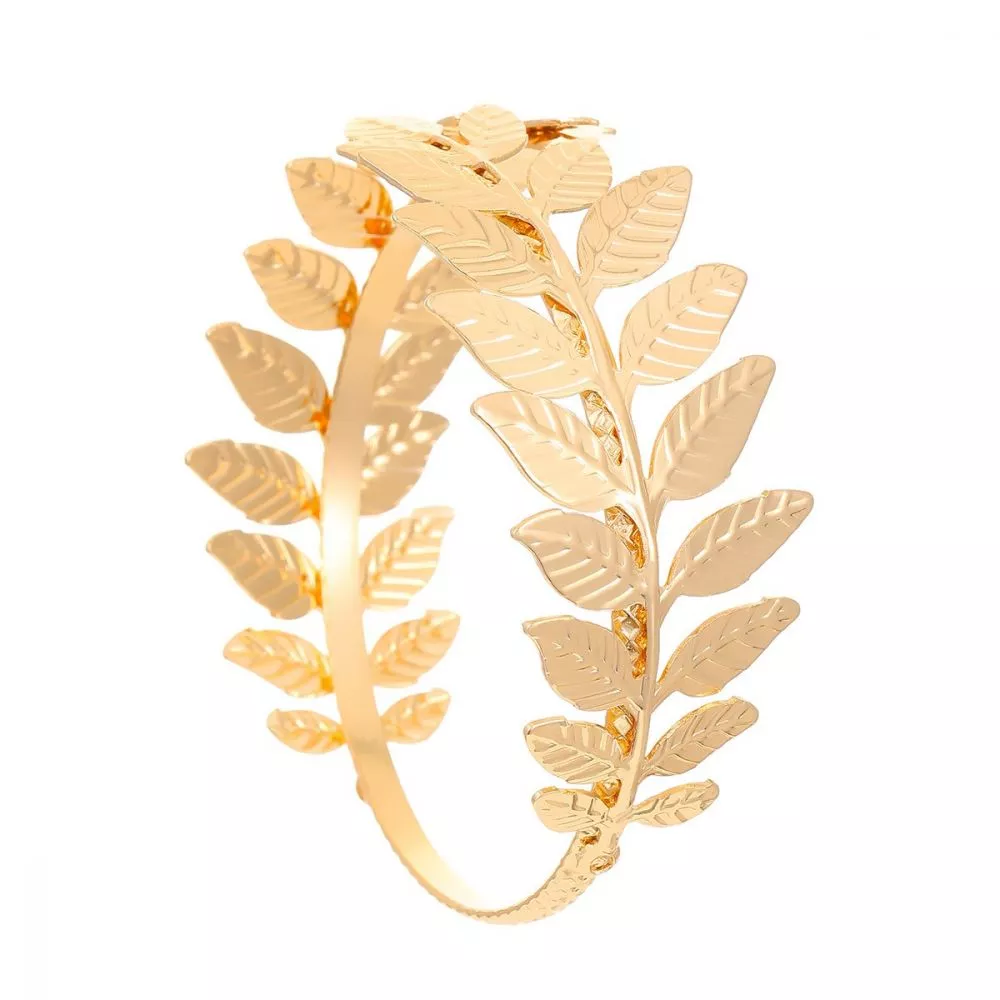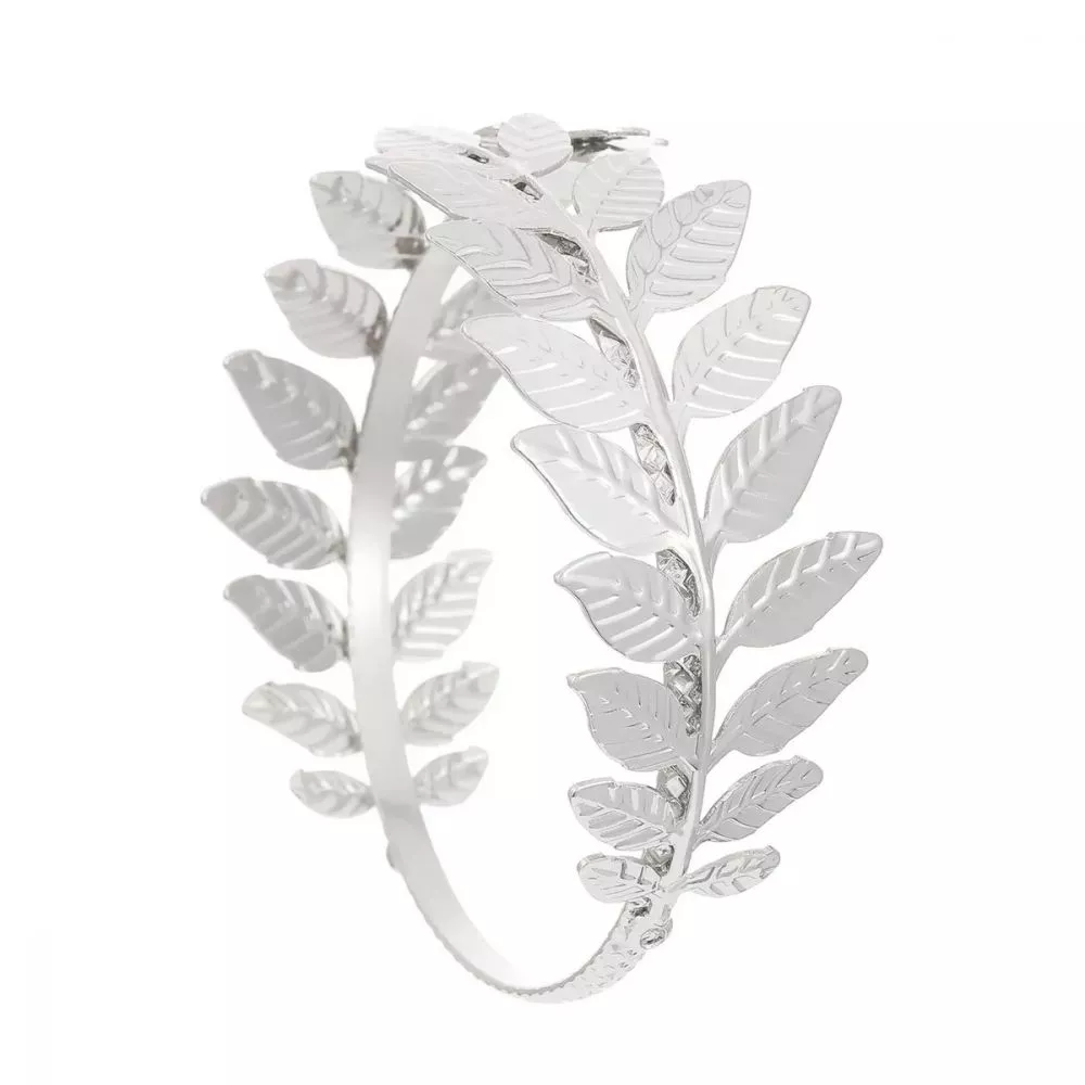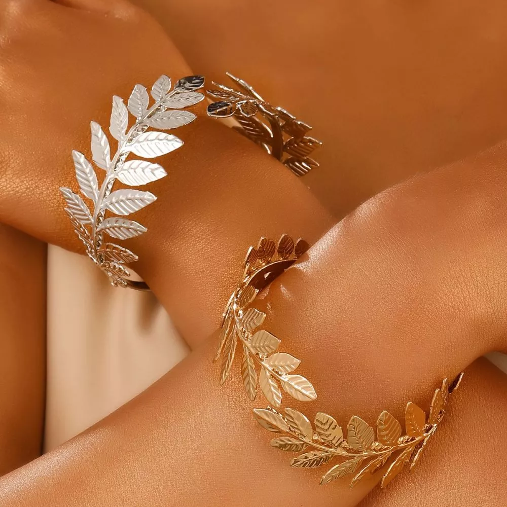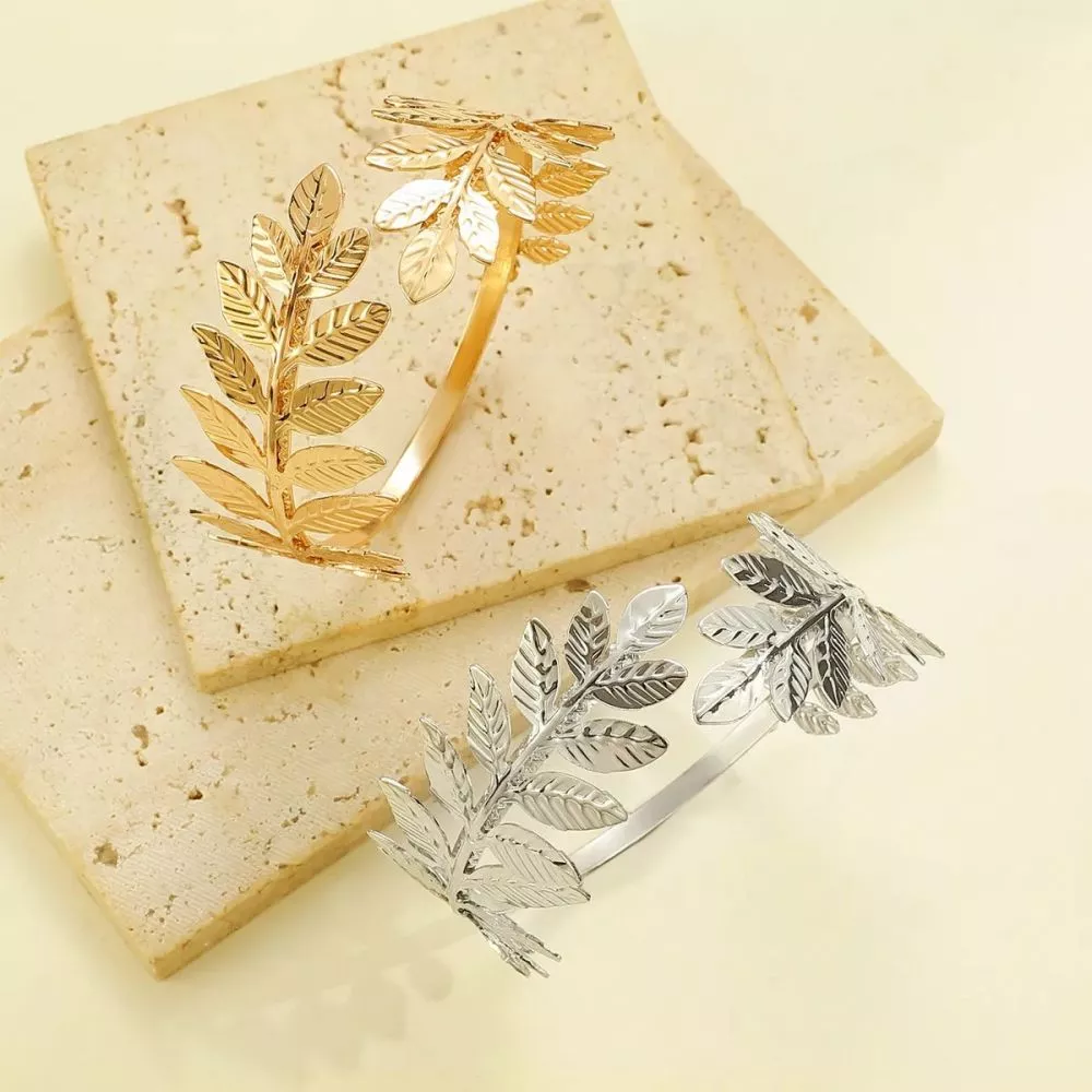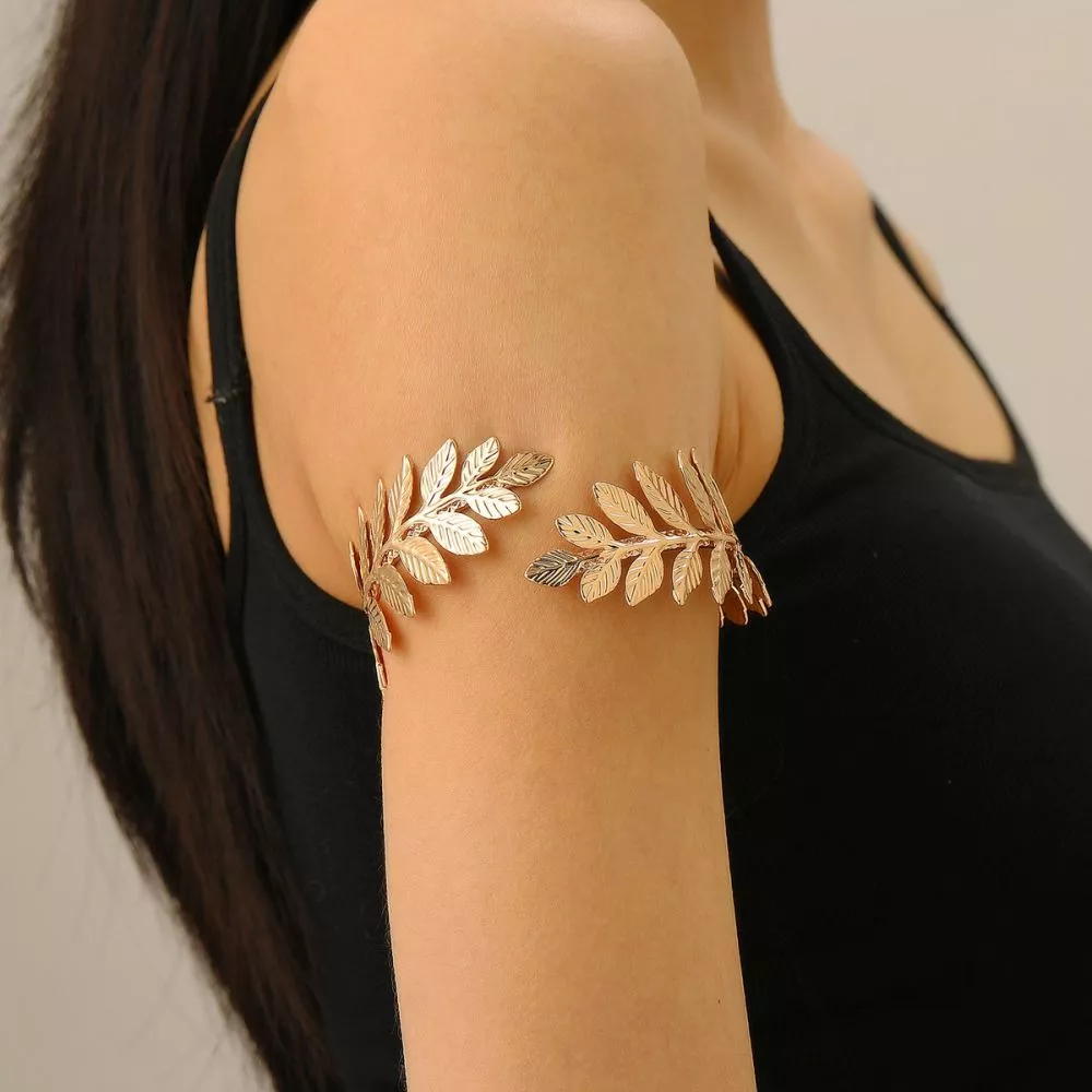 Bracciale da braccio con design a foglie decorative, pensato per valorizzare il look con un tocco scenografico ed elegante. La struttura rigida ma regolabile si adatta perfettamente al braccio, creando un effetto raffinato e distintivo. Le foglie lavorate donano movimento e luminosità, trasformando questo accessorio in un elemento protagonista ideale per outfit estivi, serate o look più ricercati.