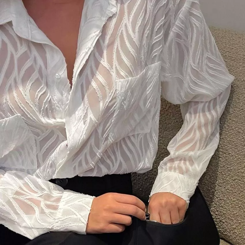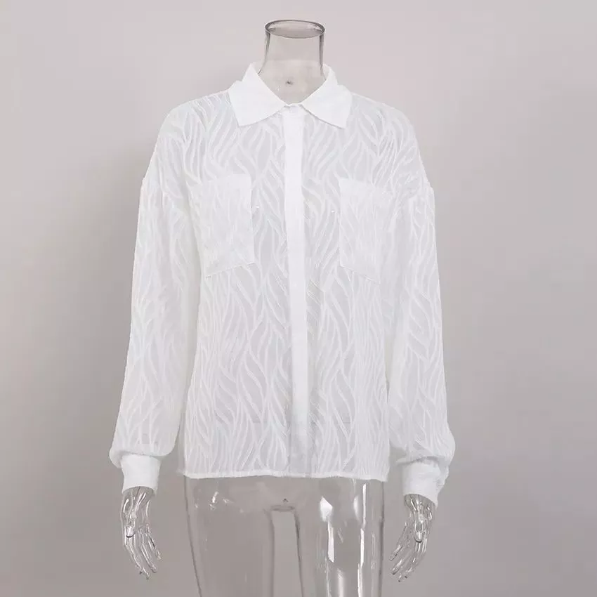 Camicetta da donna in chiffon leggero di colore bianco, caratterizzata da una texture semi-trasparente e da maniche lunghe con costruzione fluida. Il design presenta una linea morbida che non aderisce al corpo, favorendo comfort e libertà di movimento.