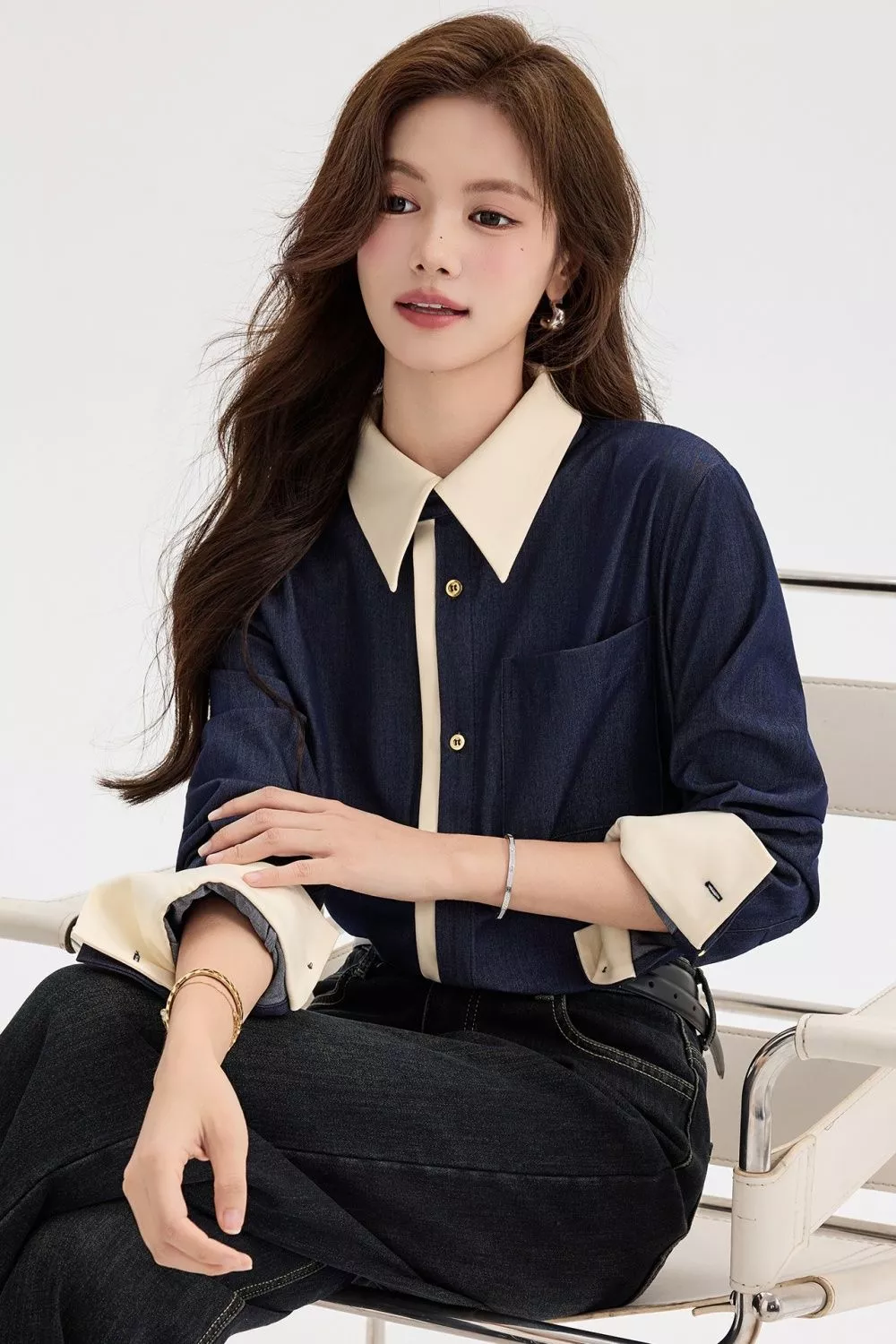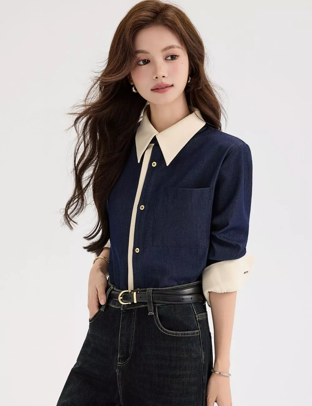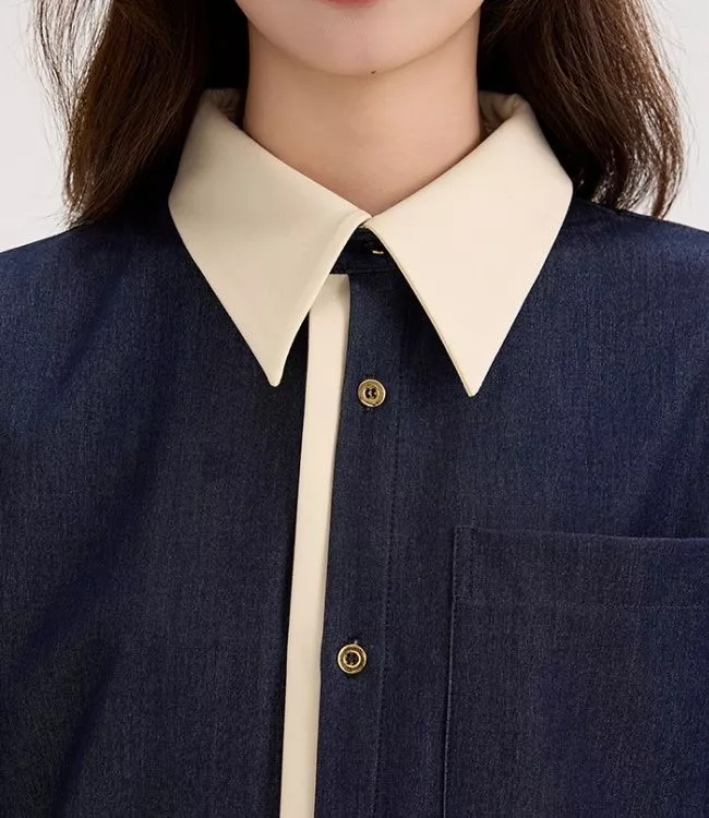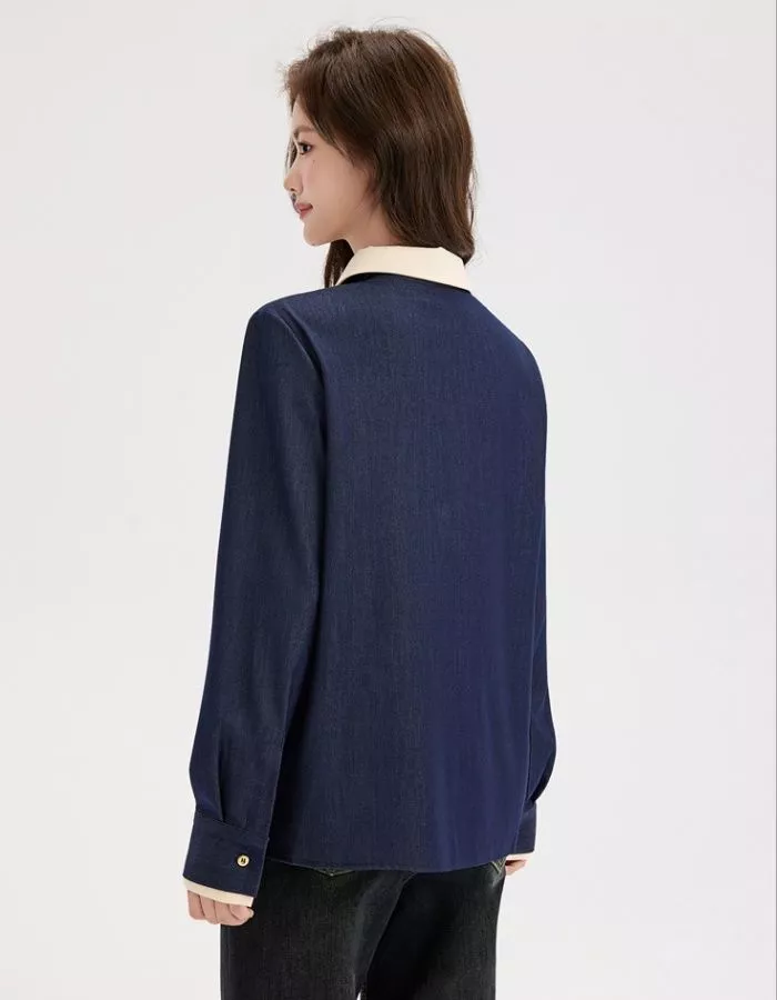 Camicia Denim Blu Contrasto Beige Elegante Stile Moderno Donna Outfit CF58825