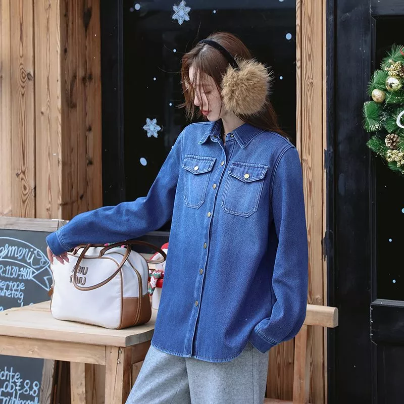 Camicia Denim Morbida Con Tasche Frontali Stile Casual Blu Donna CF61177
