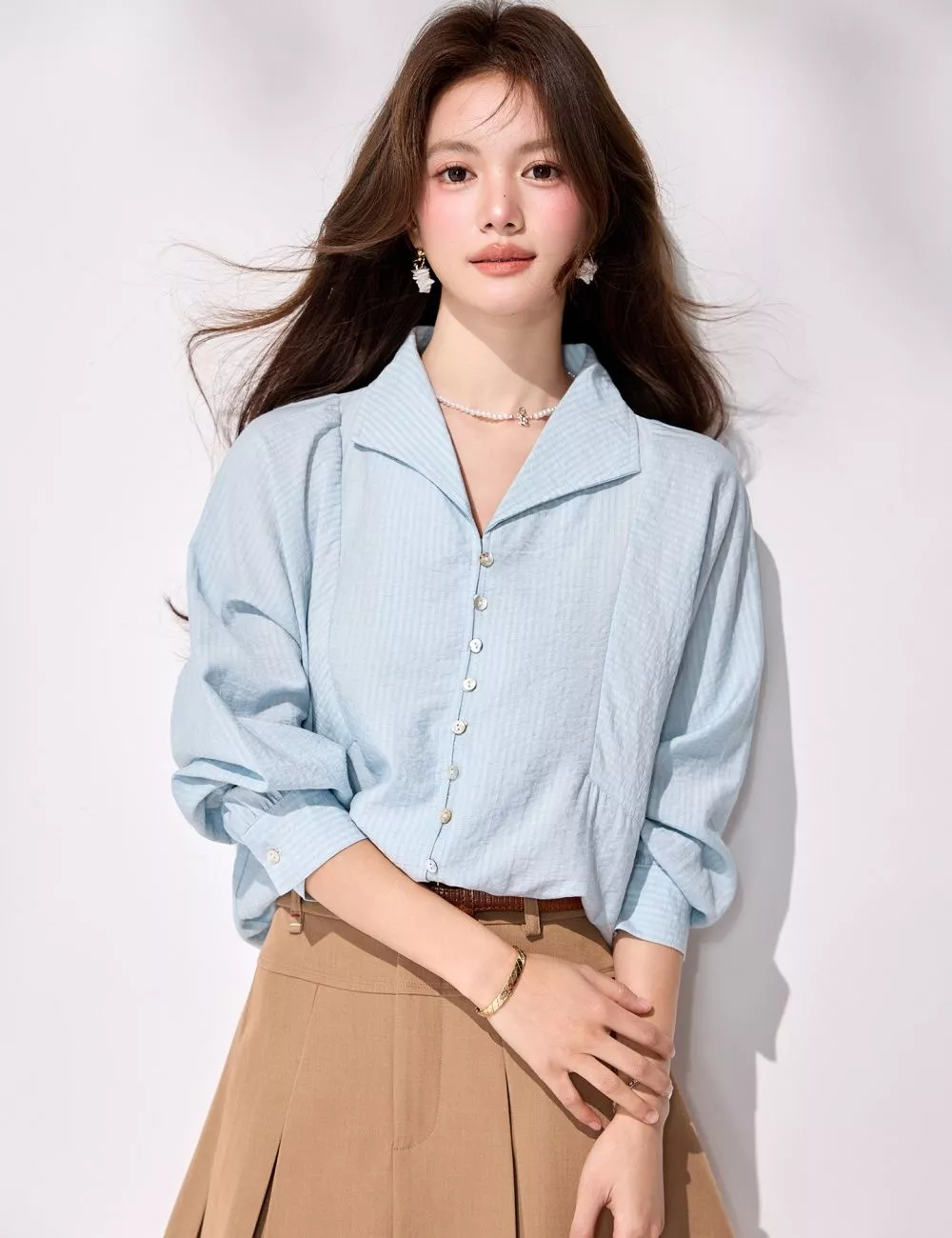Camicia donna azzurro chiaro dal design elegante e contemporaneo, caratterizzata da una linea morbida che dona movimento e comfort mantenendo uno stile raffinato. Il taglio leggermente ampio crea un effetto casual chic molto attuale, perfetto per outfit quotidiani curati.