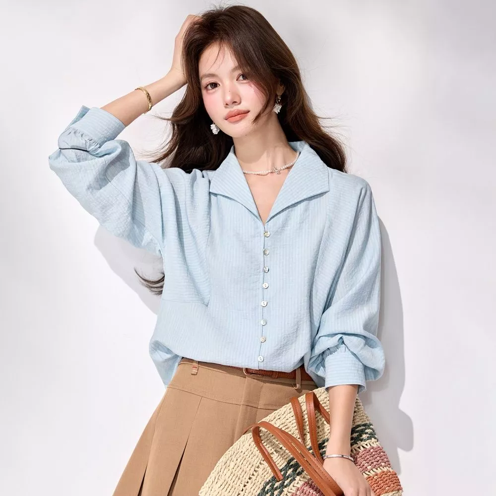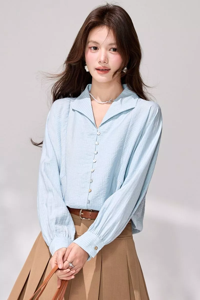 Camicia Donna Azzurro Chiaro Elegante Manica Lunga Camicia Casual Chic CF68467