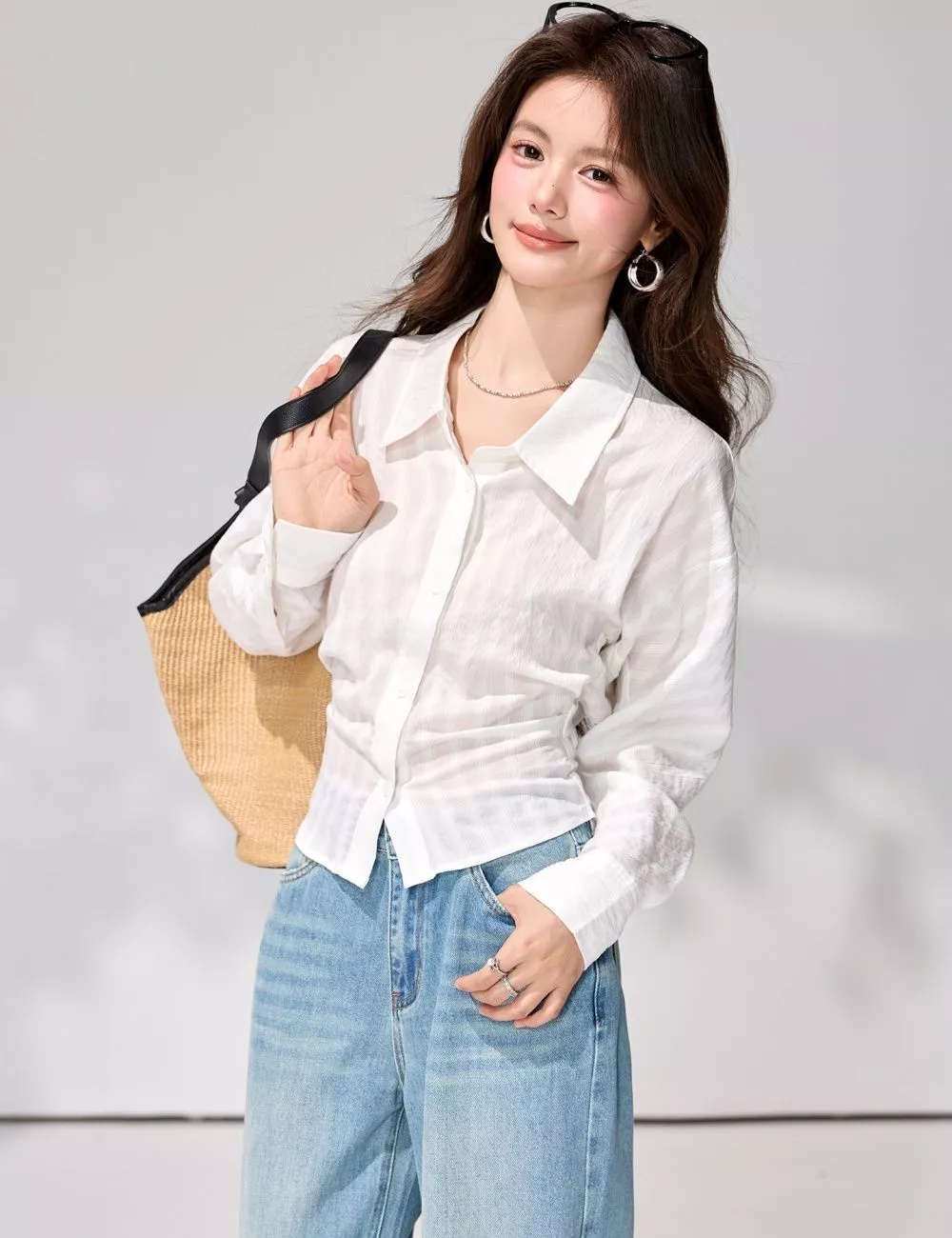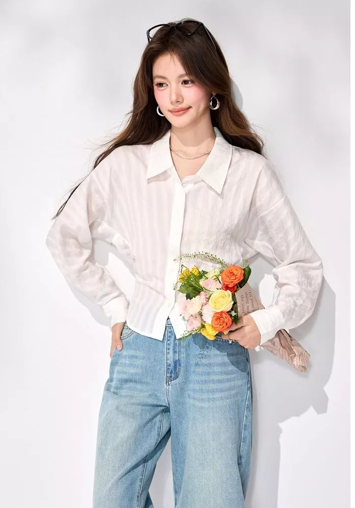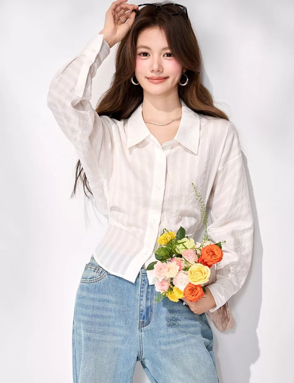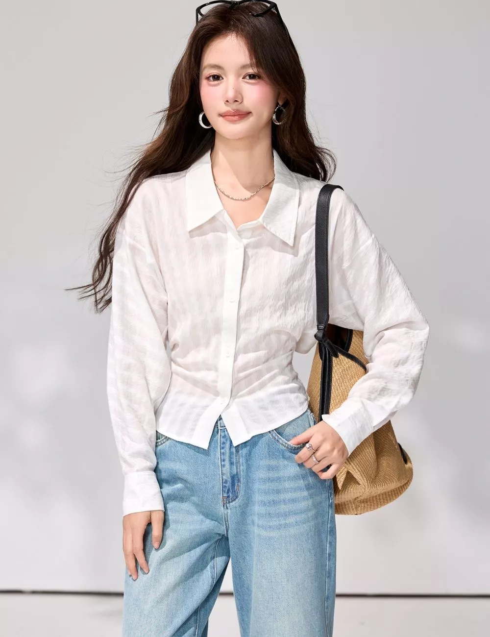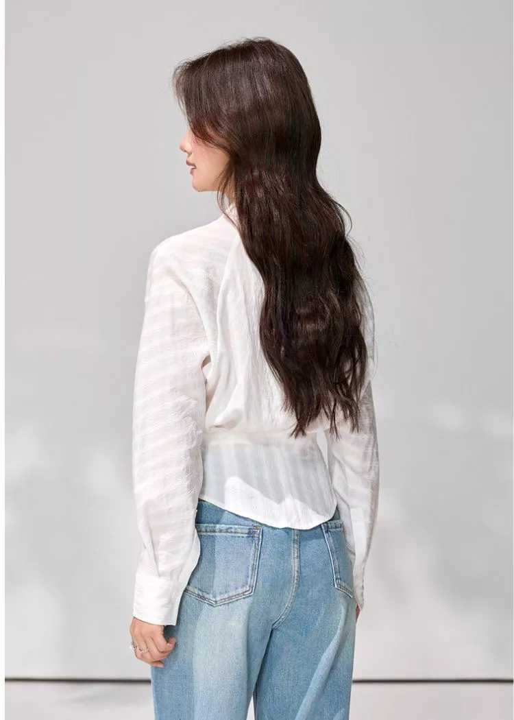 Camicia donna bianca elegante dal design pulito e femminile, caratterizzata da una linea morbida che valorizza la figura mantenendo una vestibilità confortevole. Il taglio leggermente sagomato e la lunghezza corta la rendono ideale per essere indossata con jeans, pantaloni eleganti o gonne creando look versatili e moderni.