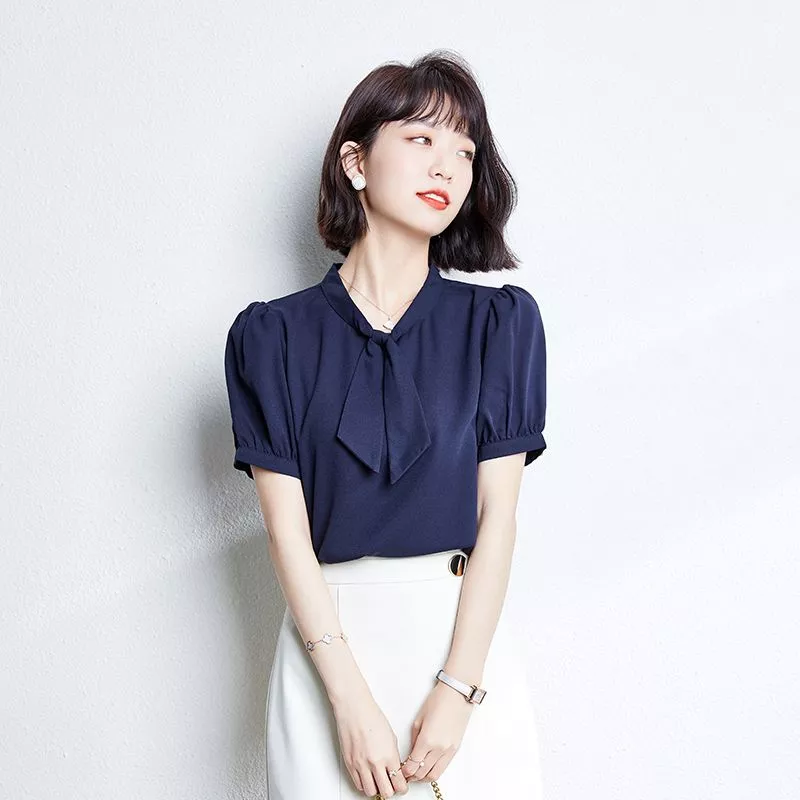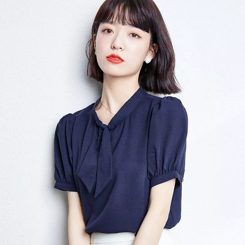 Camicia Donna Blu Navy Elegante Con Fiocco Collo Manica Corta Ufficio CF70099