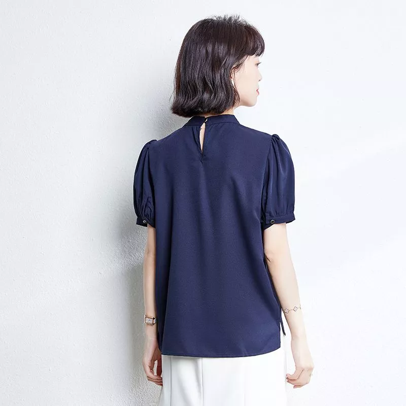 Camicia donna elegante in tonalità blu navy, caratterizzata da un raffinato fiocco al collo che valorizza il décolleté con un tocco femminile e sofisticato. La linea pulita e le maniche corte leggermente arricciate rendono questo capo perfetto per look curati e versatili, ideali sia per l’ufficio che per abbinamenti più chic. Un modello essenziale che unisce semplicità e stile, pensato per chi cerca eleganza senza rinunciare al comfort.