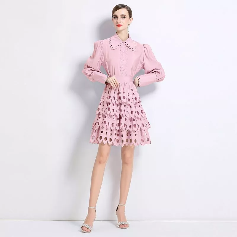 Outfit Romantico Rosa Chiaro Camicia Con Colletto E Gonna In Pizzo Chic CF52004