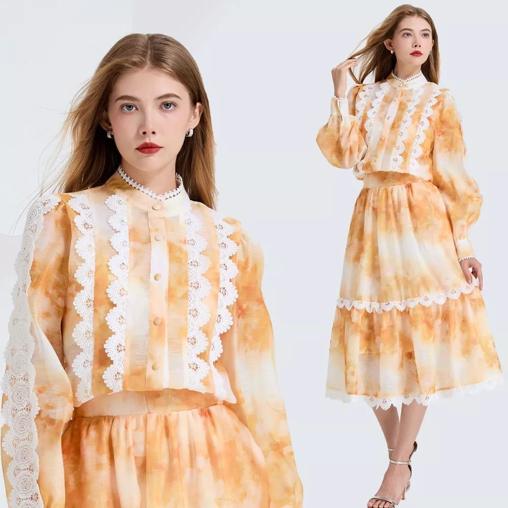 Completo Due Pezzi Gonna Midi E Top Con Pizzo Giallo Elegante Femminile CF53059