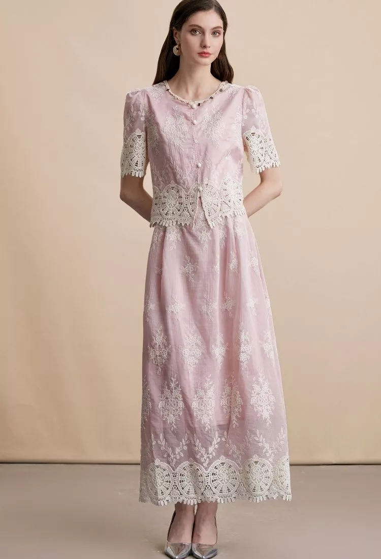 Vestito Rosa Ricamato Elegante 2 Pezzi Gilet E Gonna Cerimonia Romantica CF54181