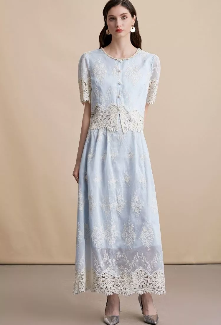 Vestito Blu Ricamato Elegante 2 Pezzi Gilet E Gonna Cerimonia Romantica CF54182