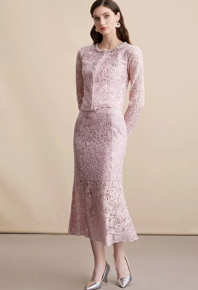 Completo Rosa Elegante In Pizzo Con Top Gioiello E Gonna Longuette CF54185