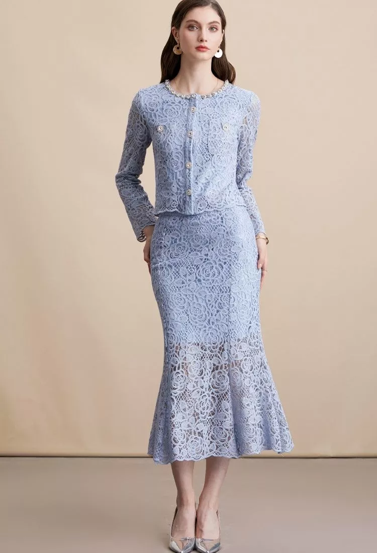 Completo Elegante In Pizzo Blu Con Top Gioiello E Gonna Longuette CF54186