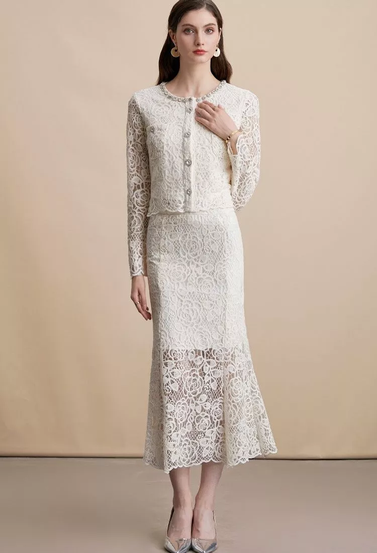 Completo Elegante In Pizzo Color Albicocca Con Top E Gonna Longuette CF54187