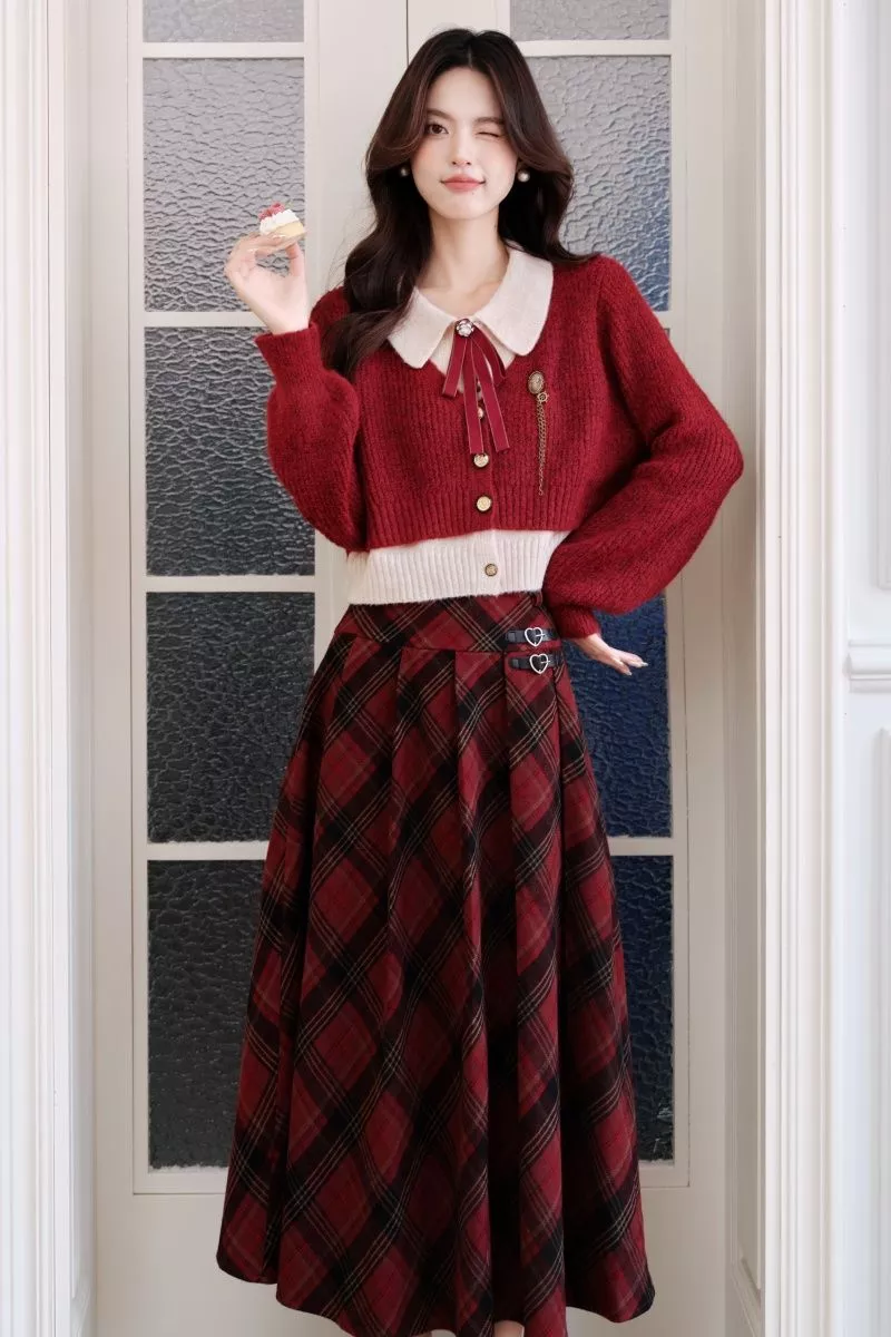 Set Donna Elegante Con Maglia A Bottoni E Gonna Lunga A Quadri Raffinato CF65143