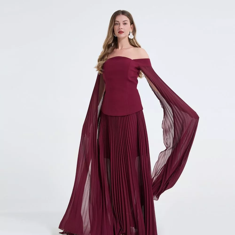 Completo Elegante Rosso Vino Top Bardot Gonna Lunga Plissé Evento CF67031