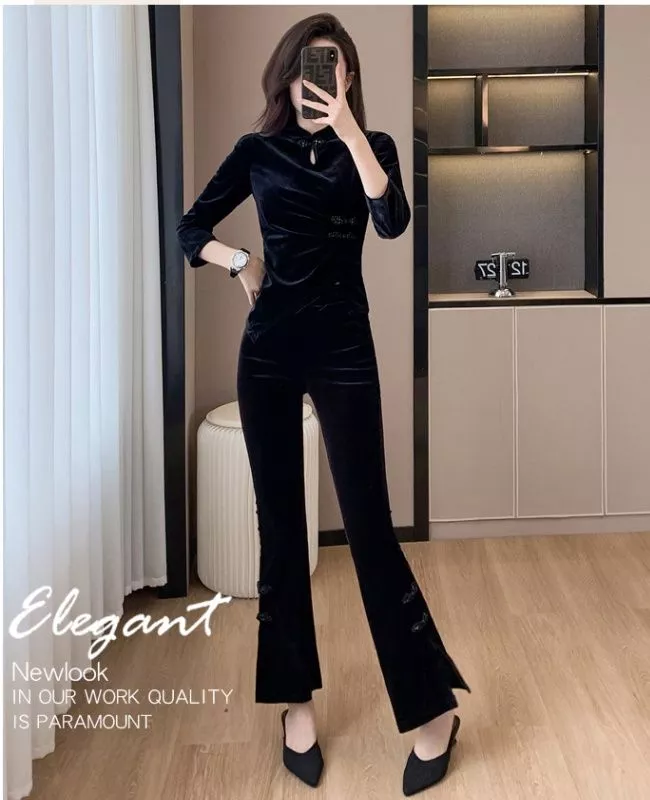 Completo Nero In Velluto 2 Pezzi Con Top E Pantaloni Svasati Eleganti CF54817