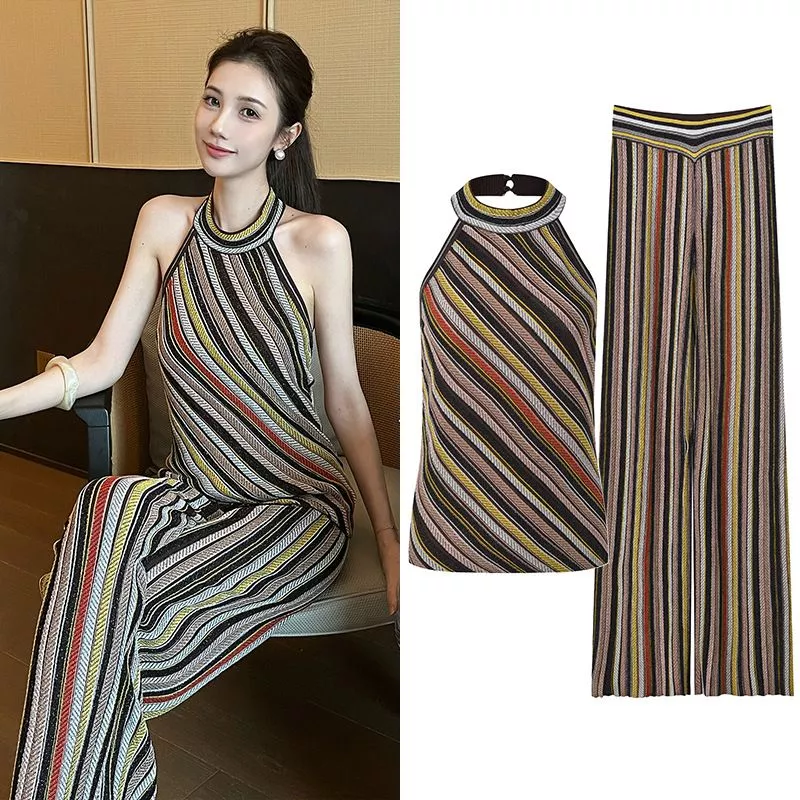 Set Donna Elegante A Righe Con Top Halter E Pantaloni A Gamba Ampia CF61288