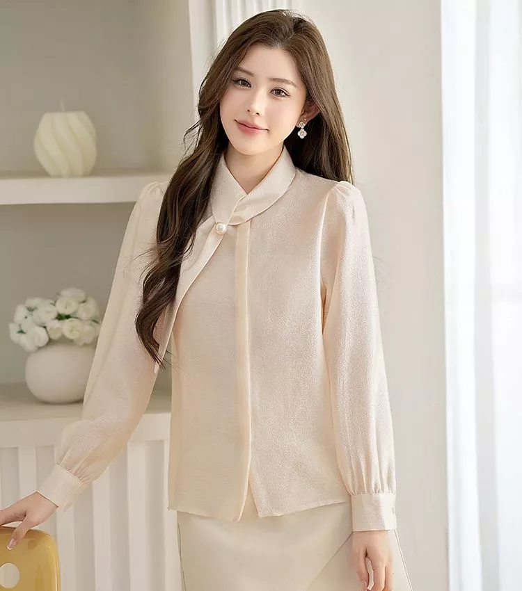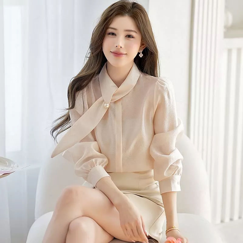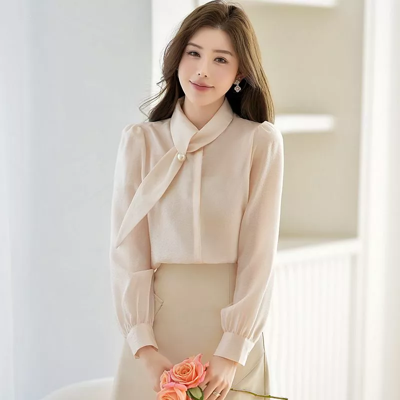 Camicia Elegante Donna Fiocco Drappeggiato Ufficio Chic Champagne CF67258