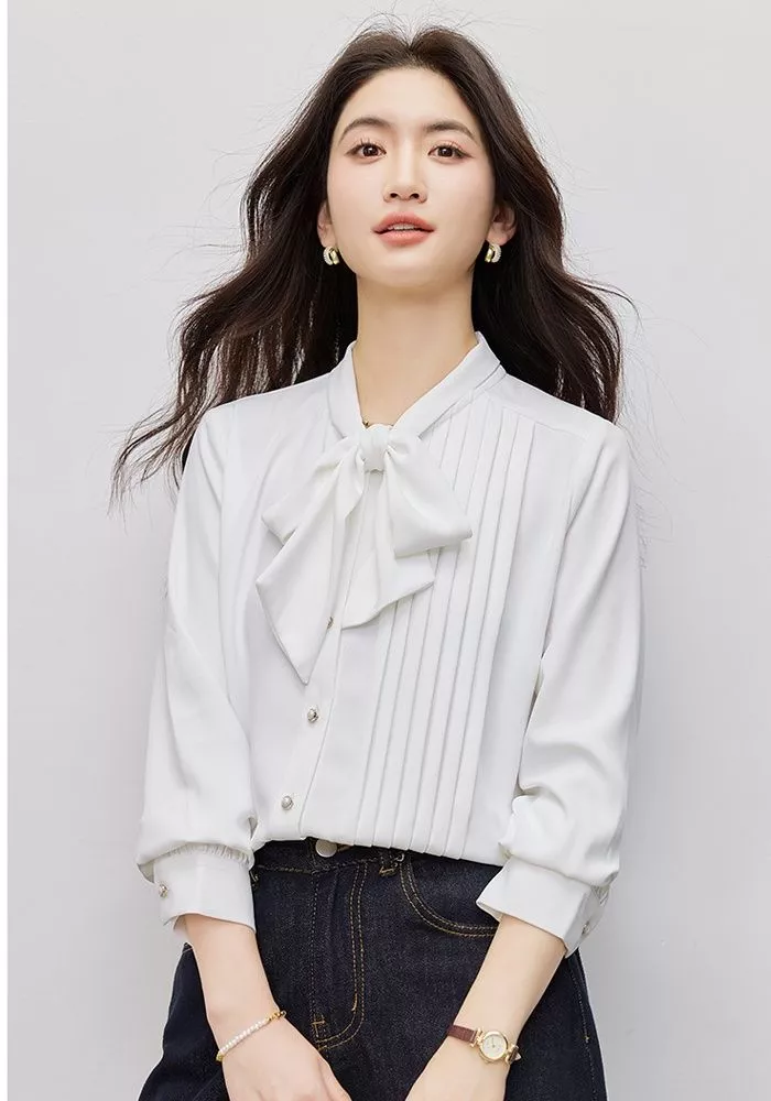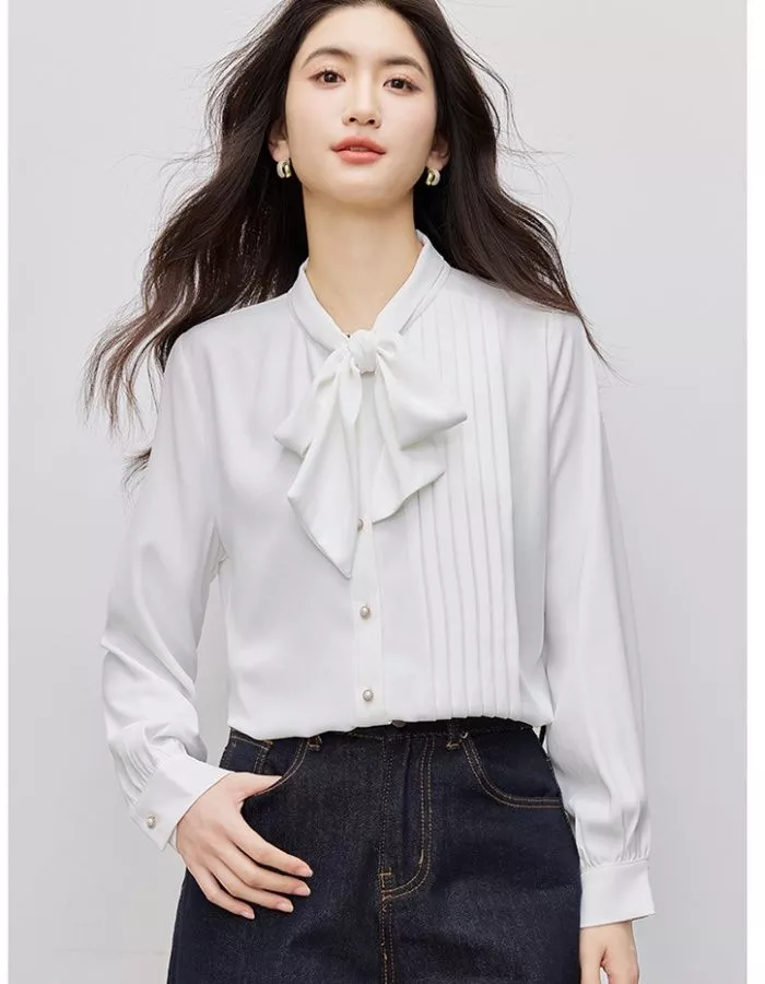 Camicia elegante da donna con fiocco al collo e linea raffinata, perfetta per ufficio, lavoro e look quotidiani curati. Il design fluido con pieghe frontali valorizza la silhouette e rende il capo femminile e versatile, ideale da abbinare a pantaloni sartoriali, gonne o denim per outfit professionali e sofisticati.