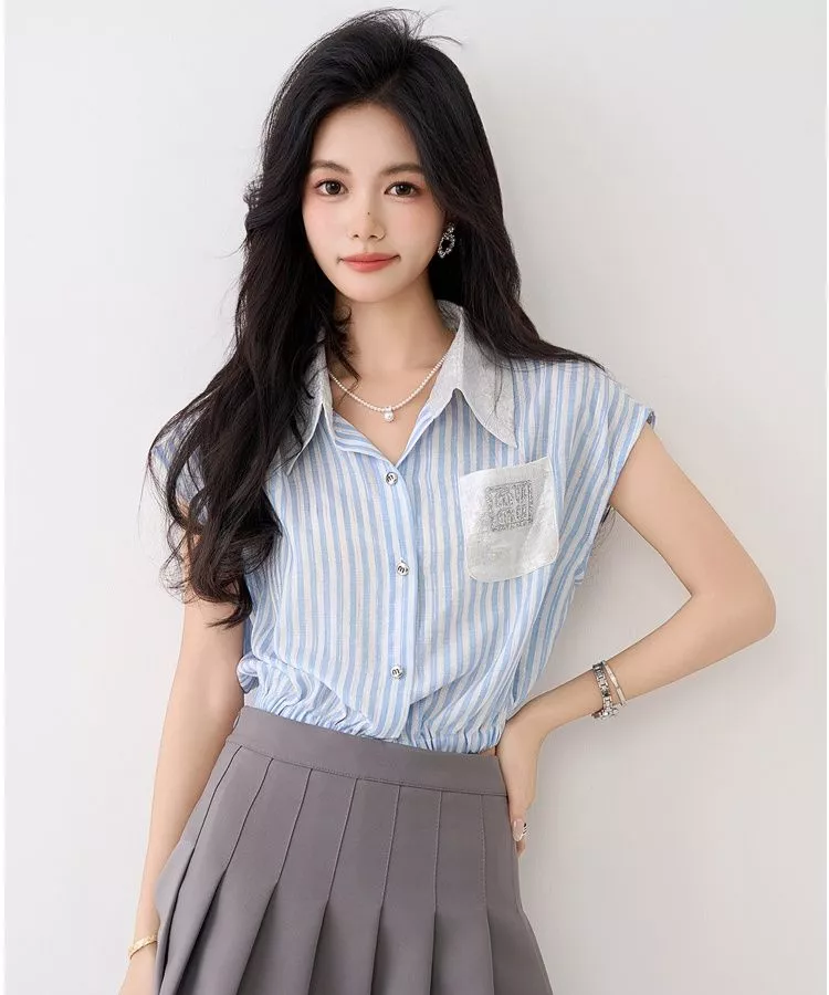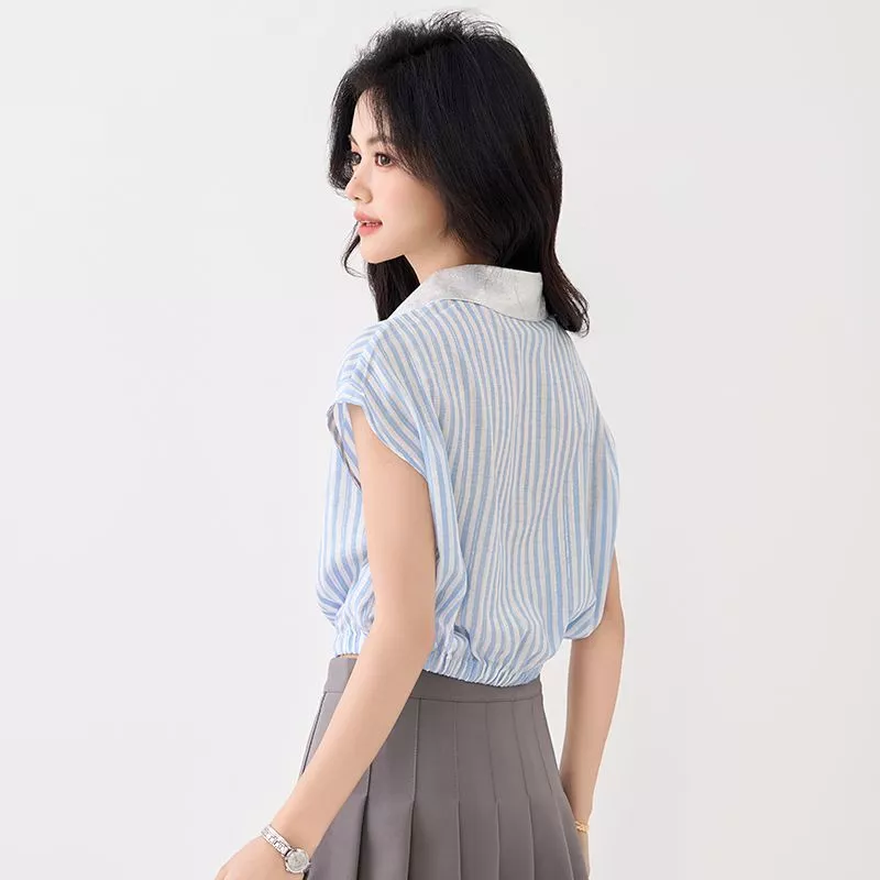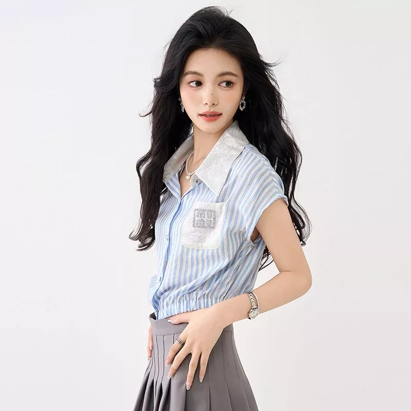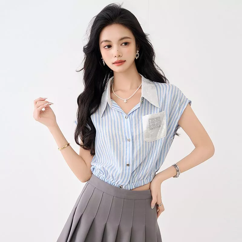 Un top camicia fresco e originale che abbina il fascino delle righe verticali blu e bianche a un elegante colletto chiaro in contrasto. Il dettaglio della taschina decorata con paillettes aggiunge un tocco luminoso e moderno, perfetto per ravvivare il tuo look da ufficio o per le uscite con le amiche. La vestibilità morbida e l’elastico in vita garantiscono comfort e una silhouette sempre in ordine. Versatile e chic, si abbina facilmente a gonne o pantaloni per uno stile sempre curato.