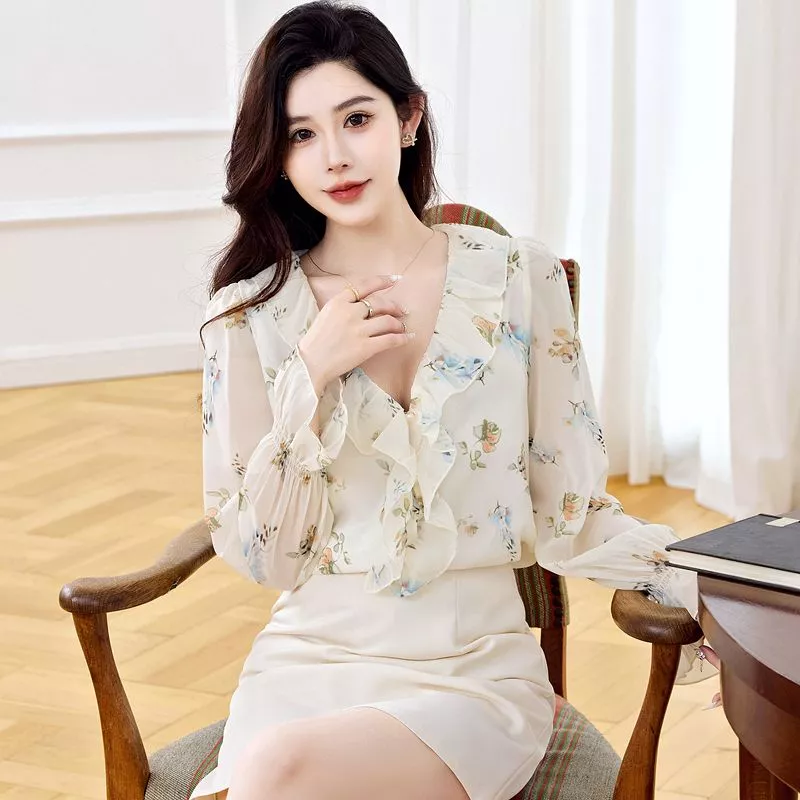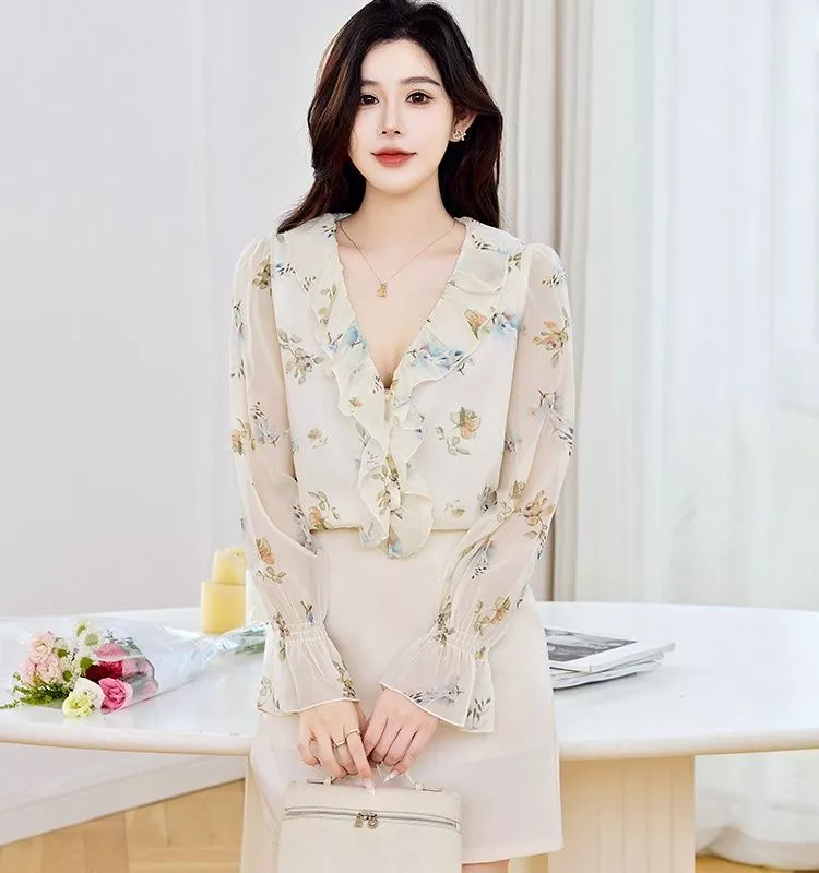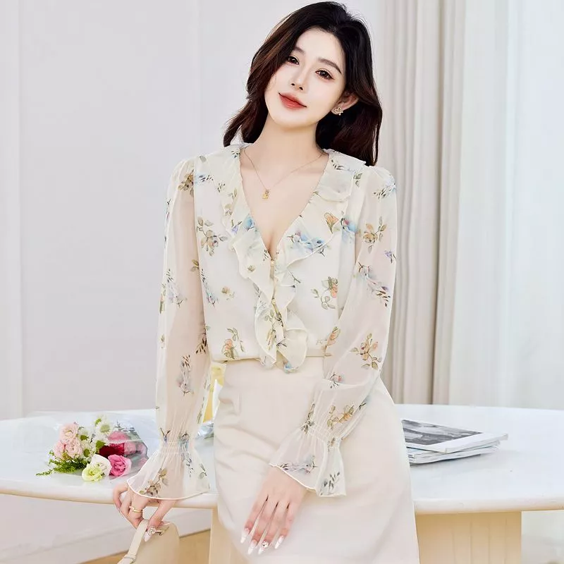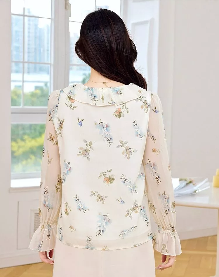 Camicia elegante in chiffon leggero con delicata stampa floreale su base chiara, ideale per un look romantico e raffinato. Il modello presenta scollo a V con volant morbidi, che valorizzano il décolleté, e maniche lunghe trasparenti leggermente arricciate al polso, per un tocco di leggerezza.