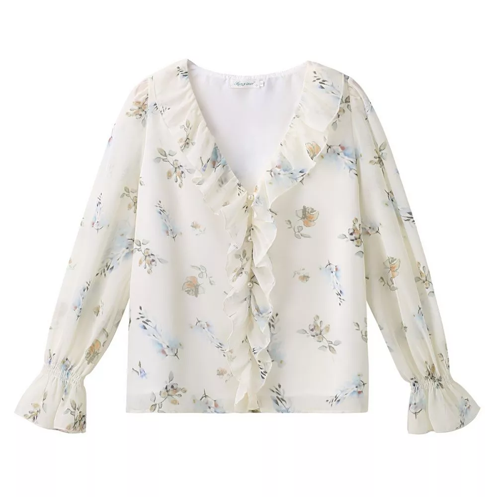 Camicia Floreale Elegante Con Volant E Scollo A V In Chiffon Chiaro CF55943