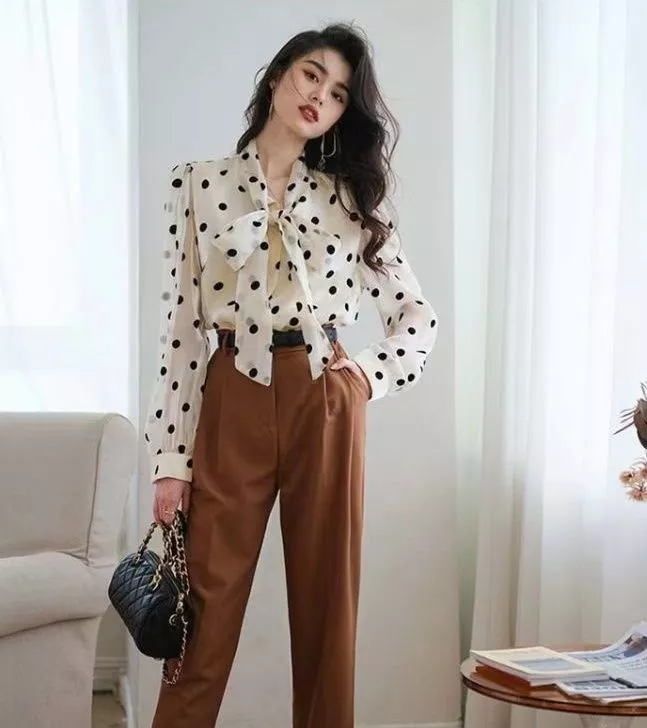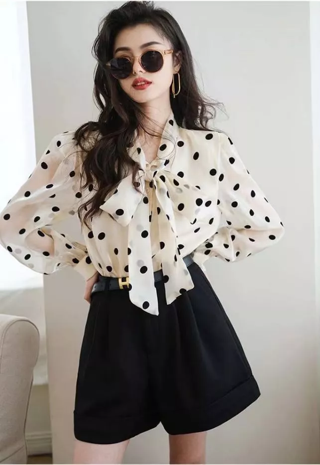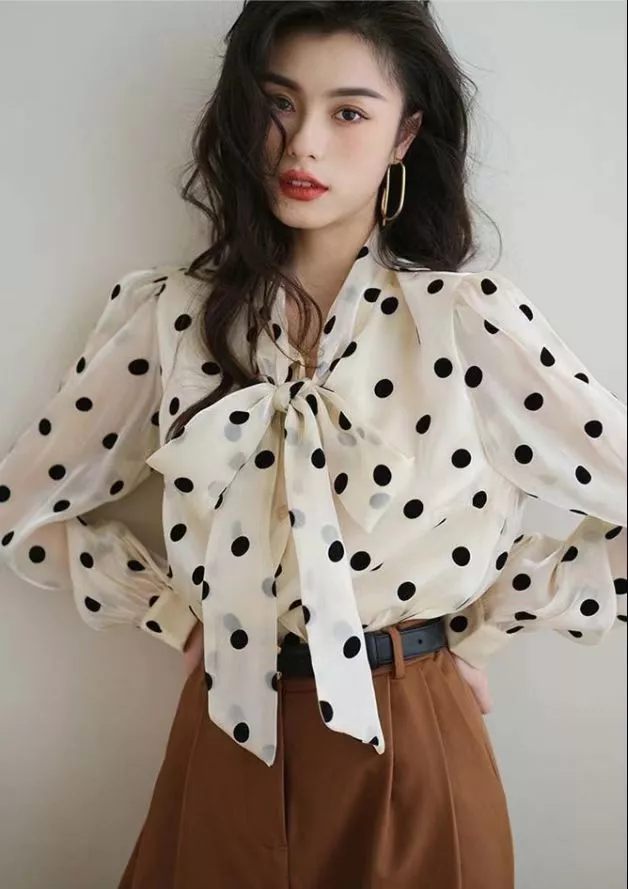 Camicia Maglia Blusa Donna Camicetta Bianco Pois Chiffon Raso Elegante 77580