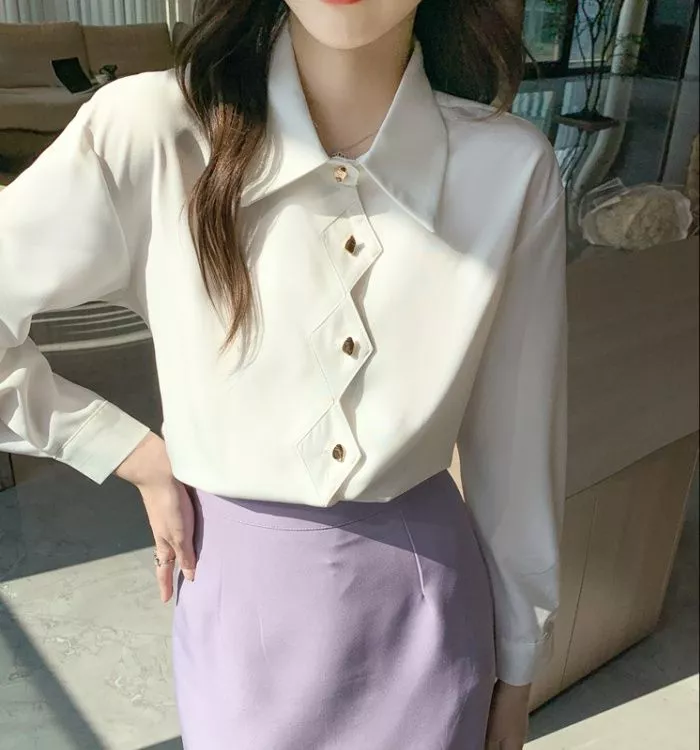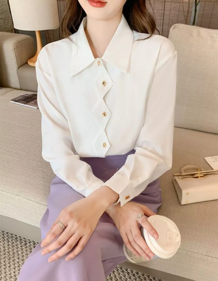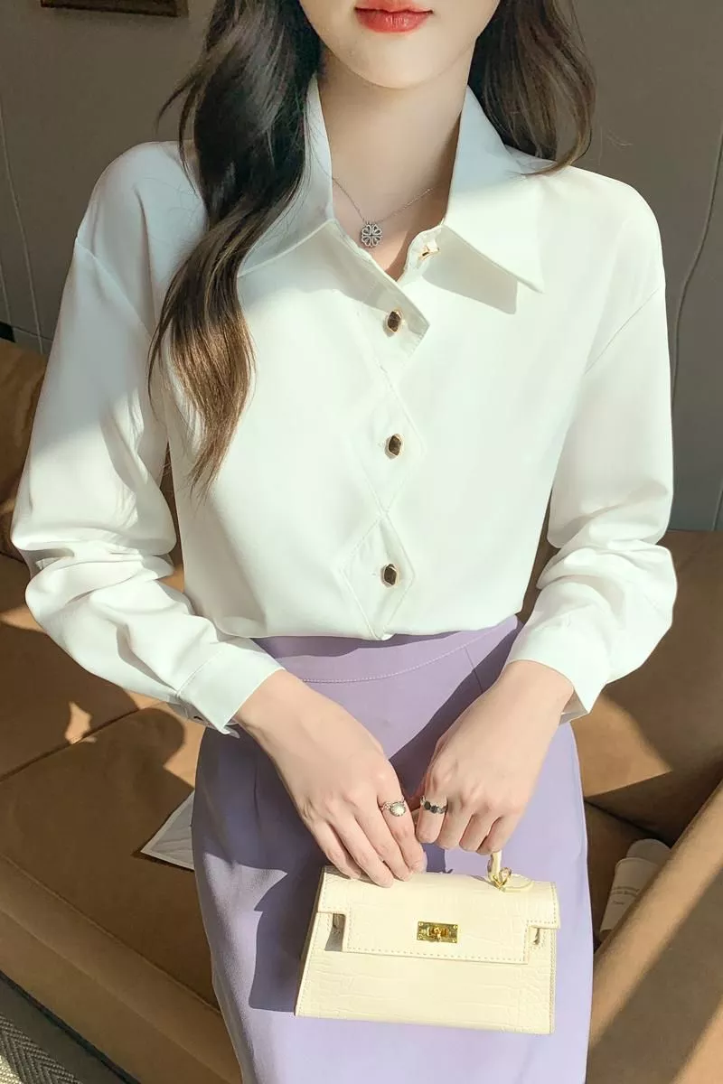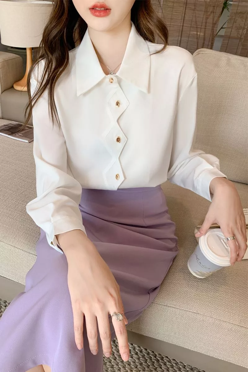 Camicia Maglia Blusa Donna Camicetta Bianco Satin Raso Morbida Elegante 01950