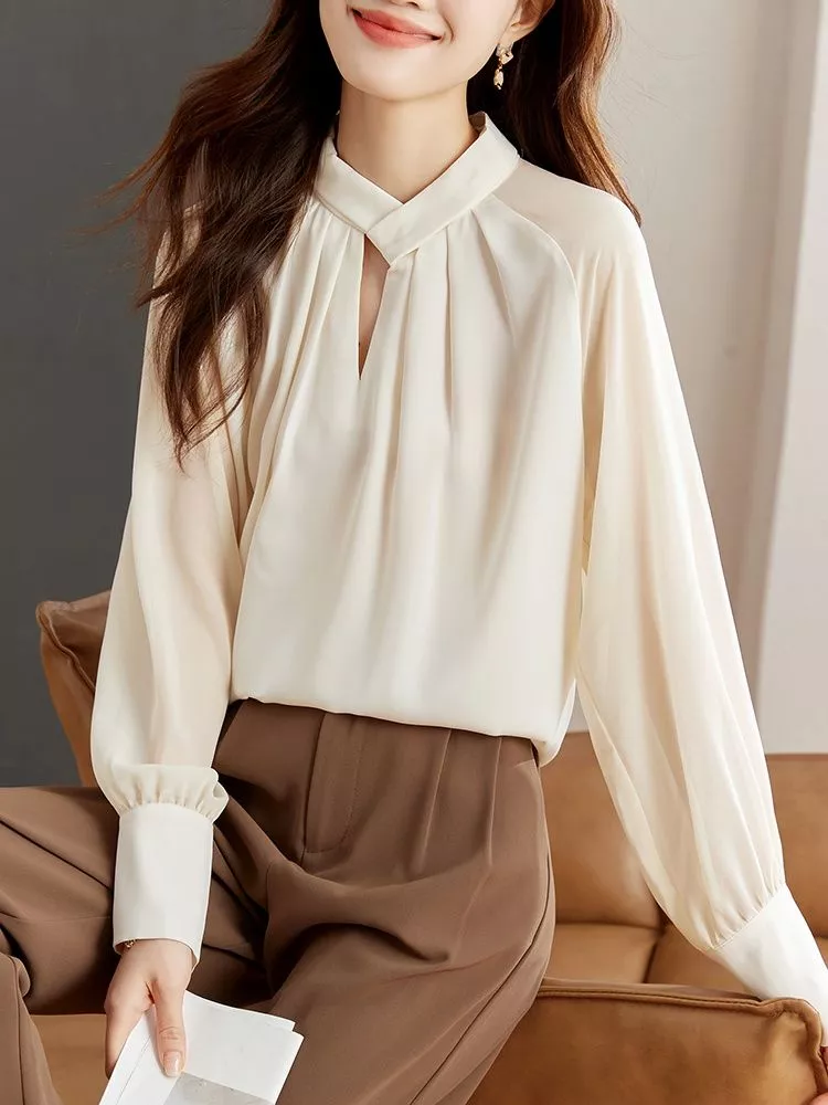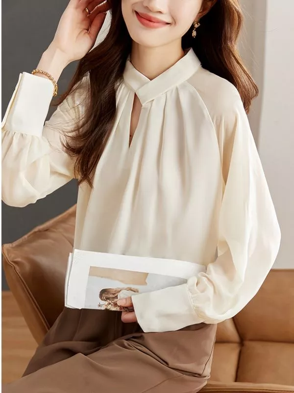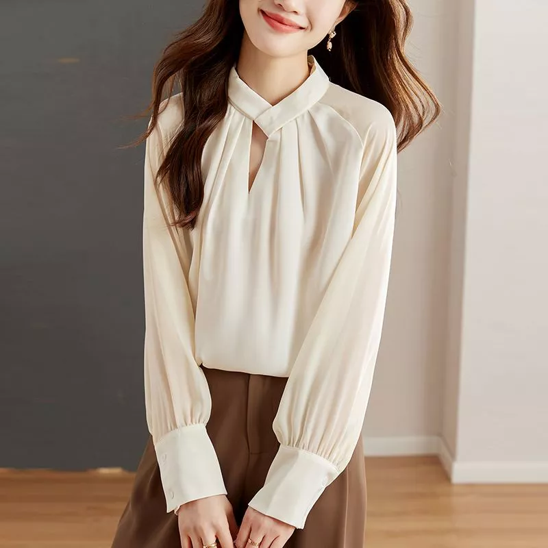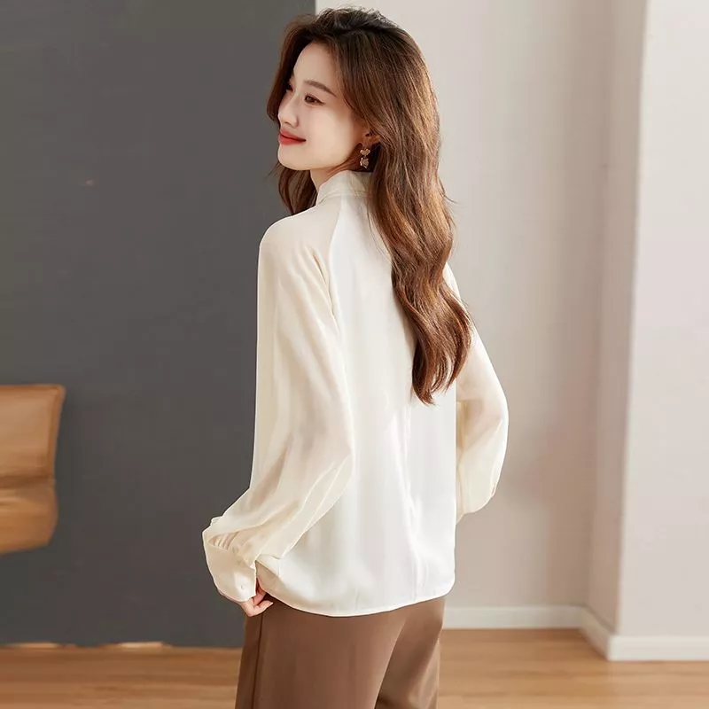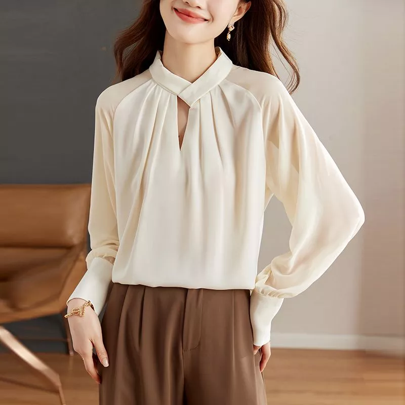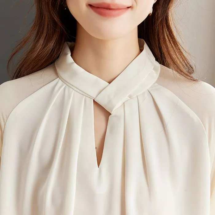 Camicia Maglia Blusa Donna Camicetta Bianco Satin Raso Morbida Elegante 02214