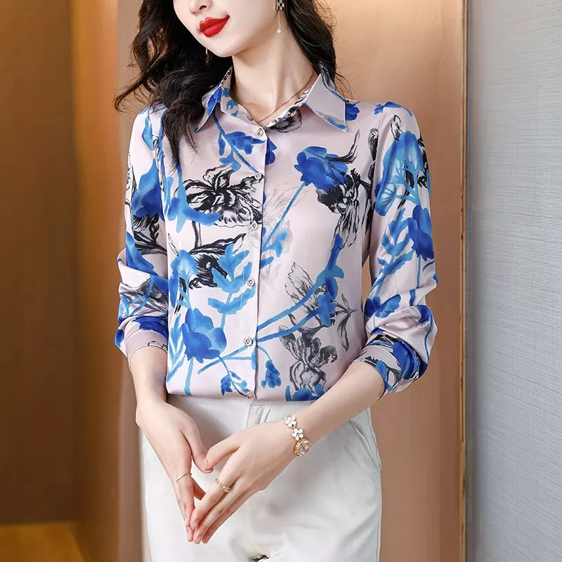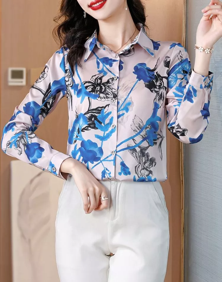 Camicia Maglia Blusa Donna Camicetta Blu Fiori Raso Morbida Elegante 02582