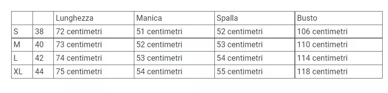 | XL | 44 | 75 centimetri | 54 centimetri | 55 centimetri | 118 centimetri |