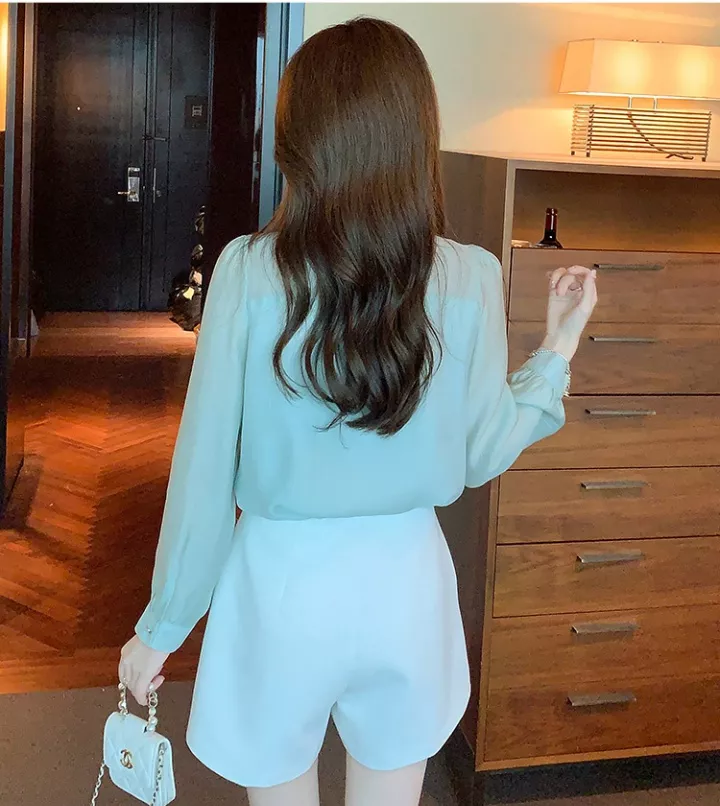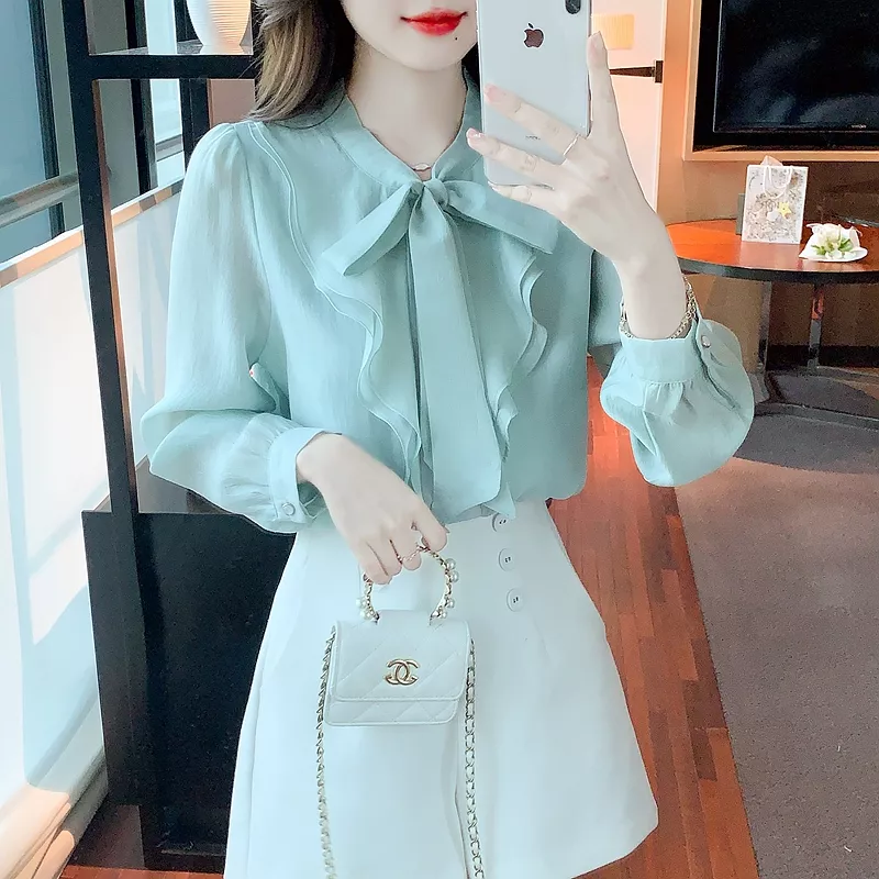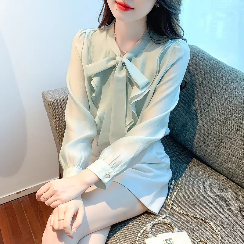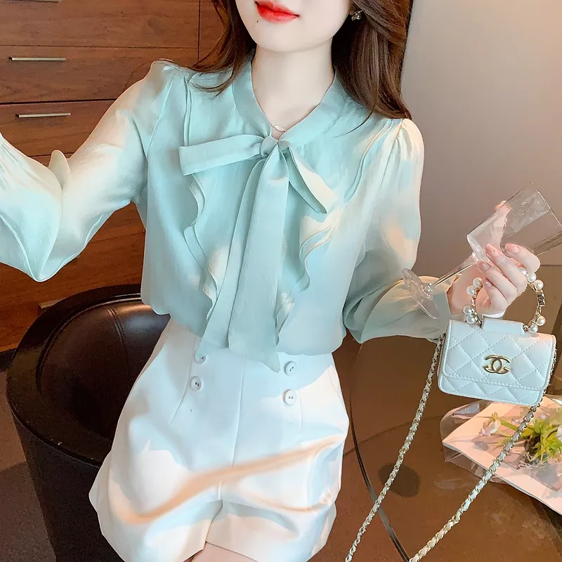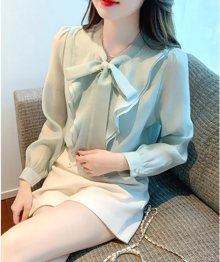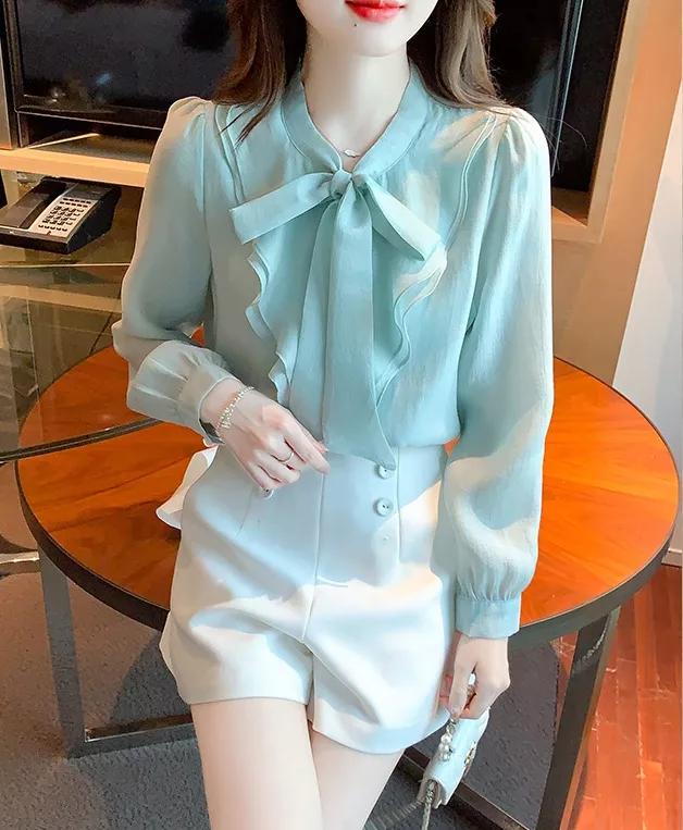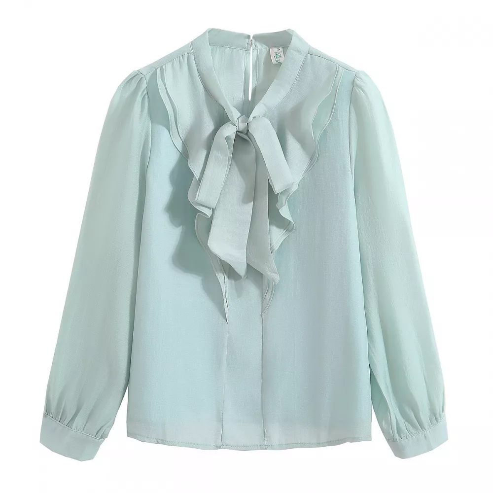Camicia Maglia Blusa Donna Camicetta Maniche Lunghe Verde Acqua Fiocco 38136