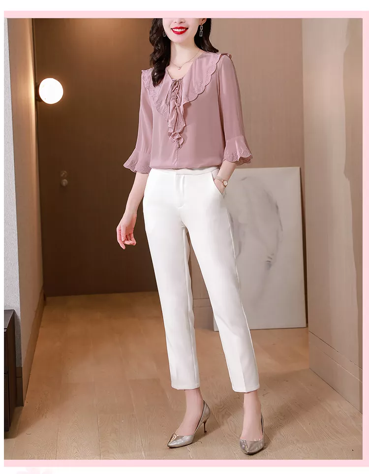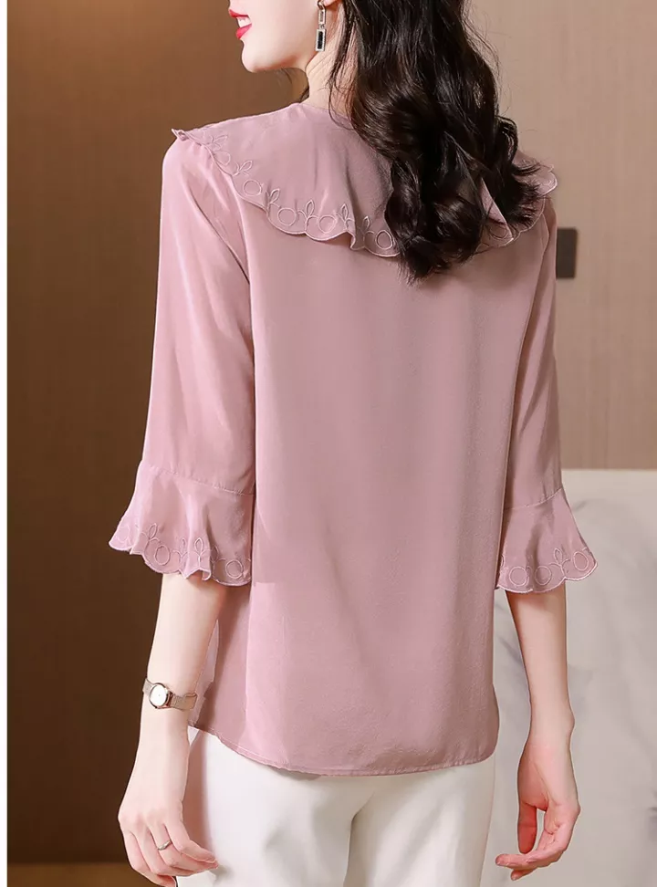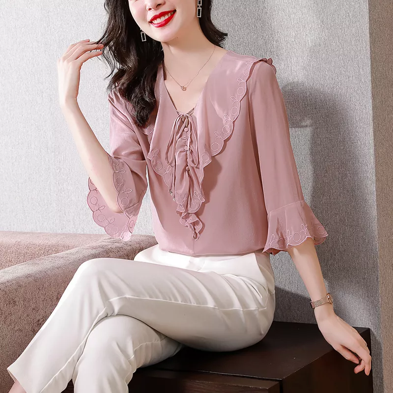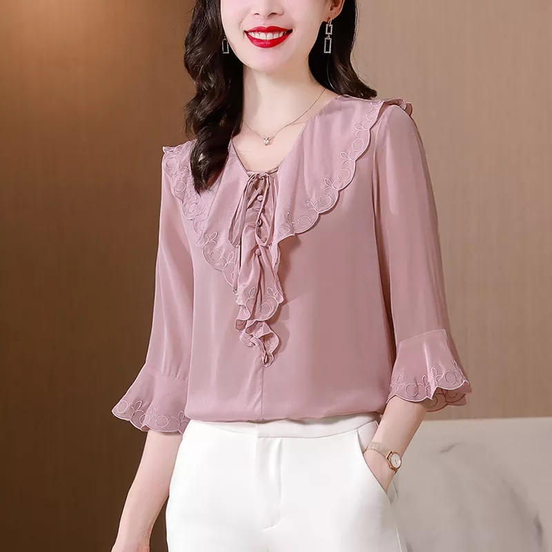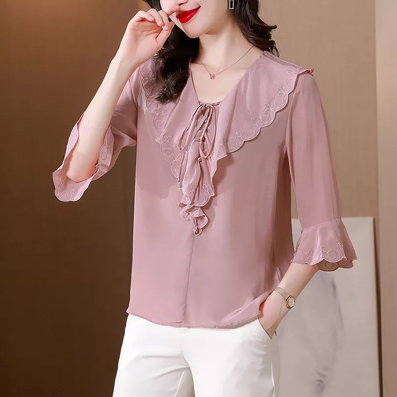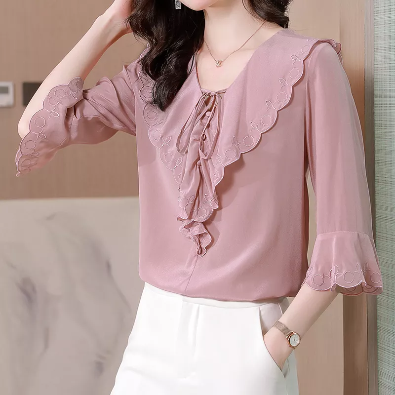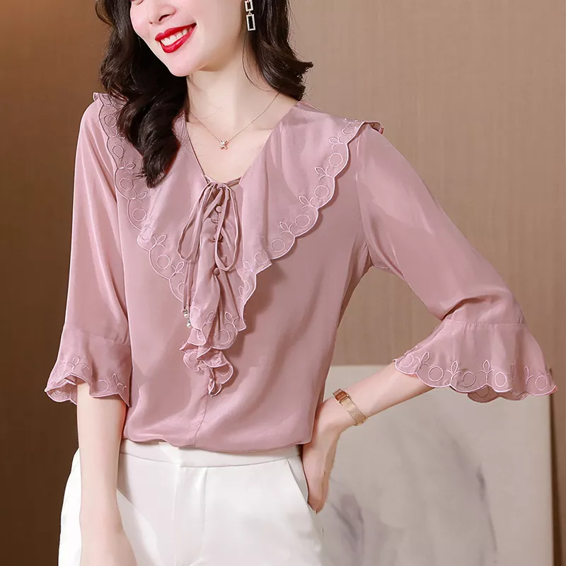 camicia maglia blusa donna camicetta maniche rosa cipria raso slim 25593