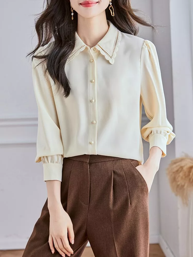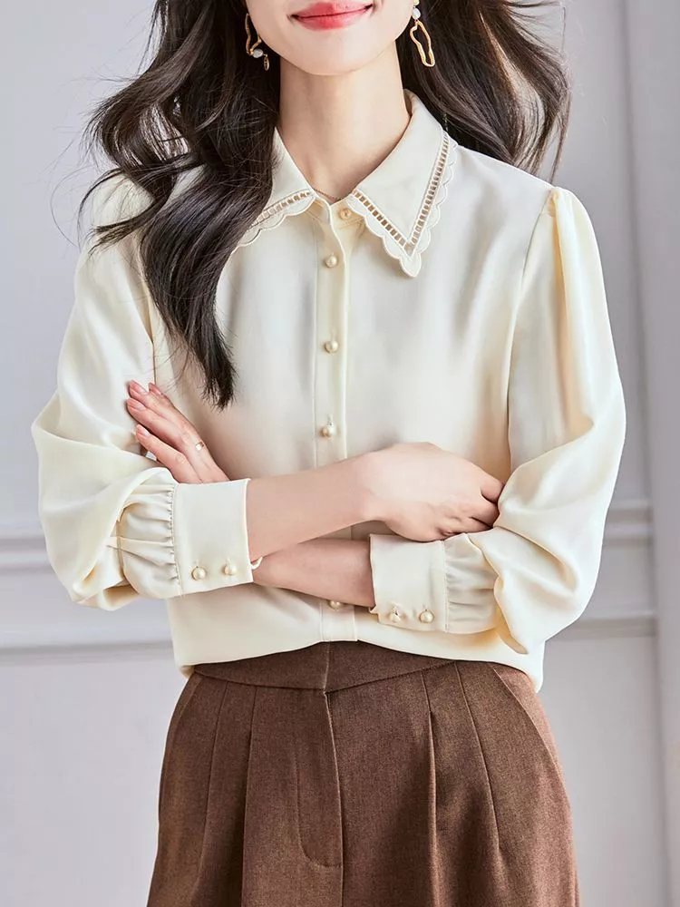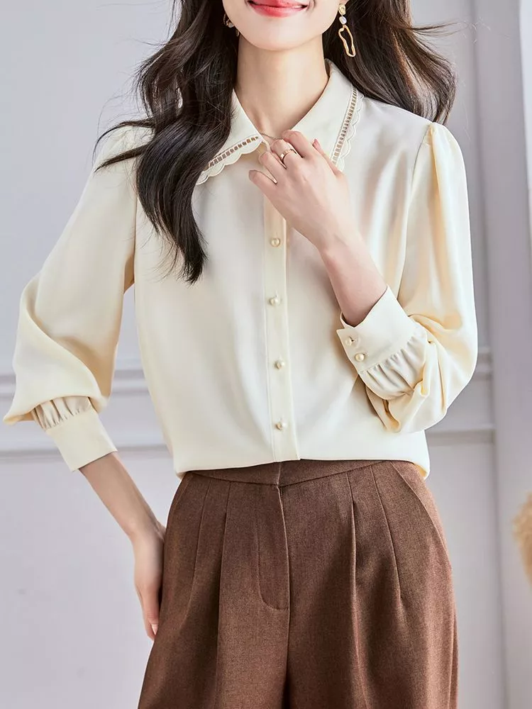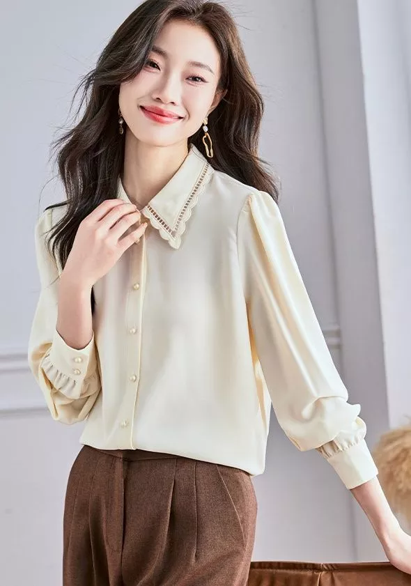 Camicia Maglia Blusa Donna Camicetta Raso Beige Chiffon Elegante 84383