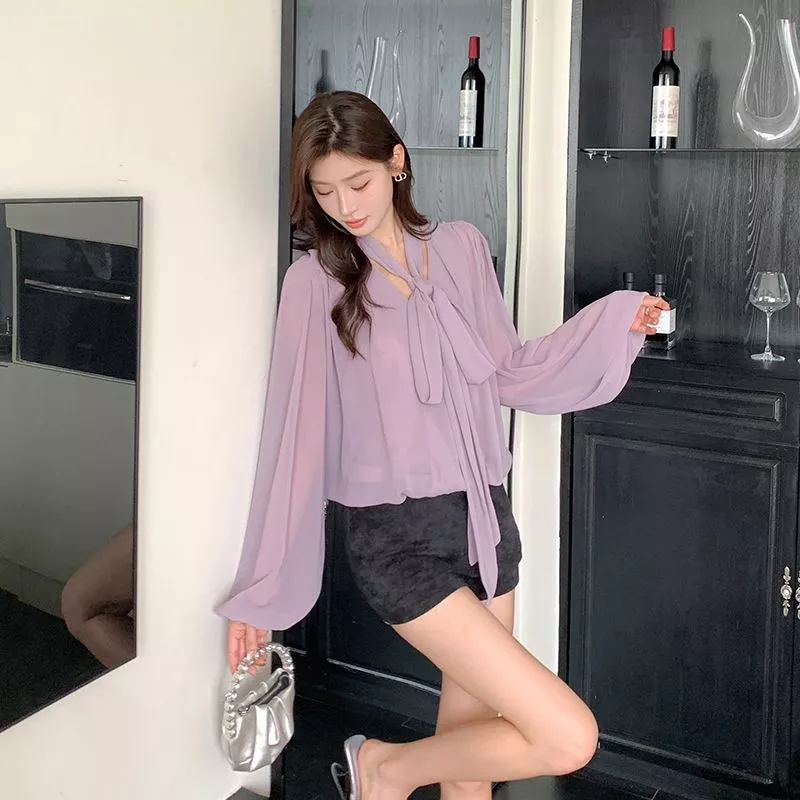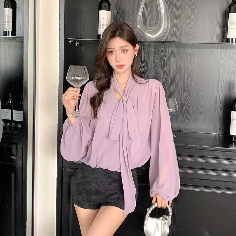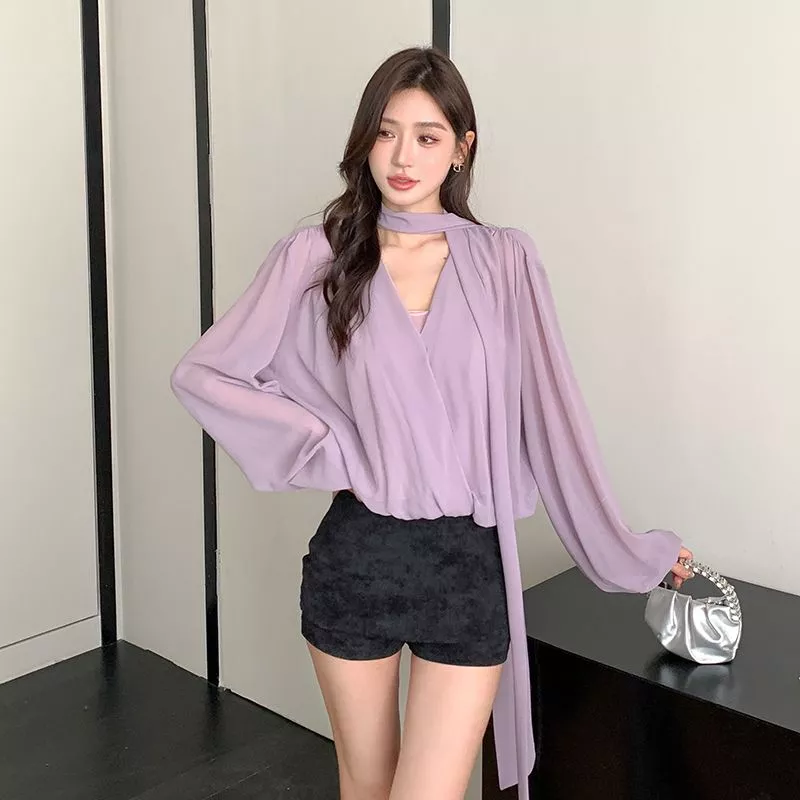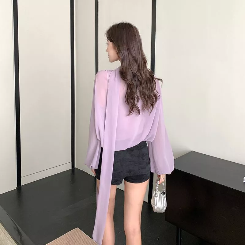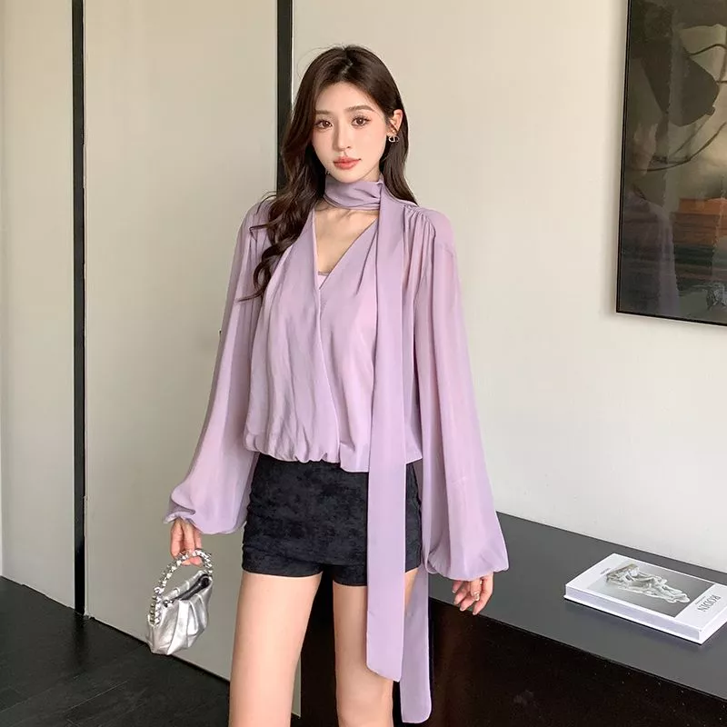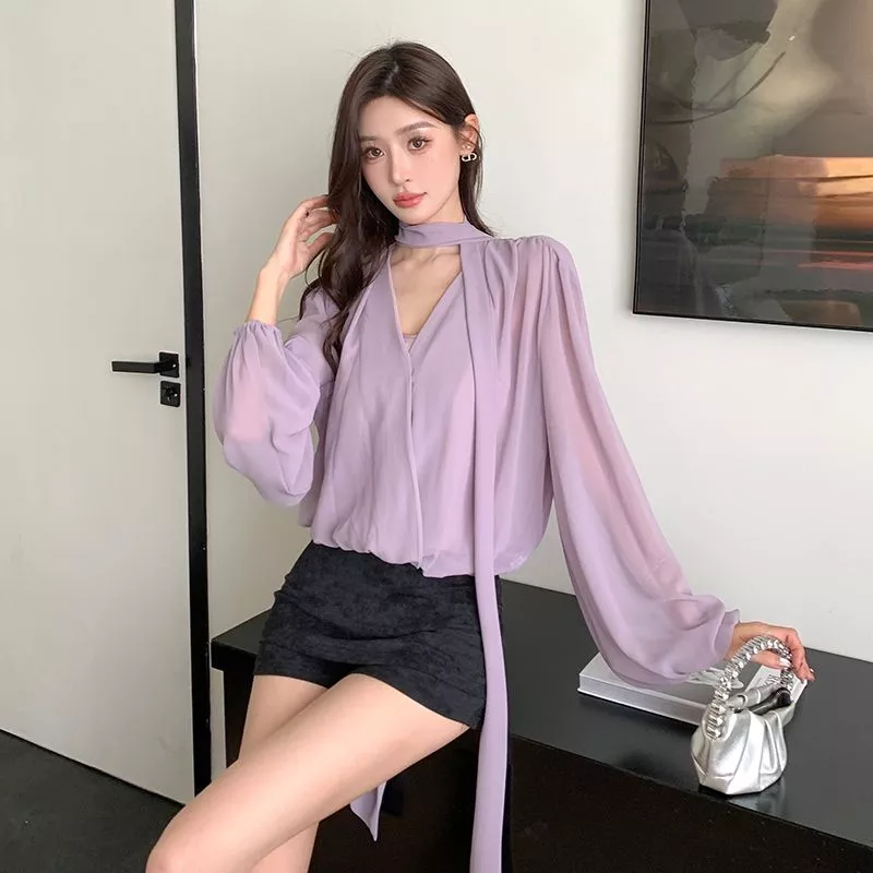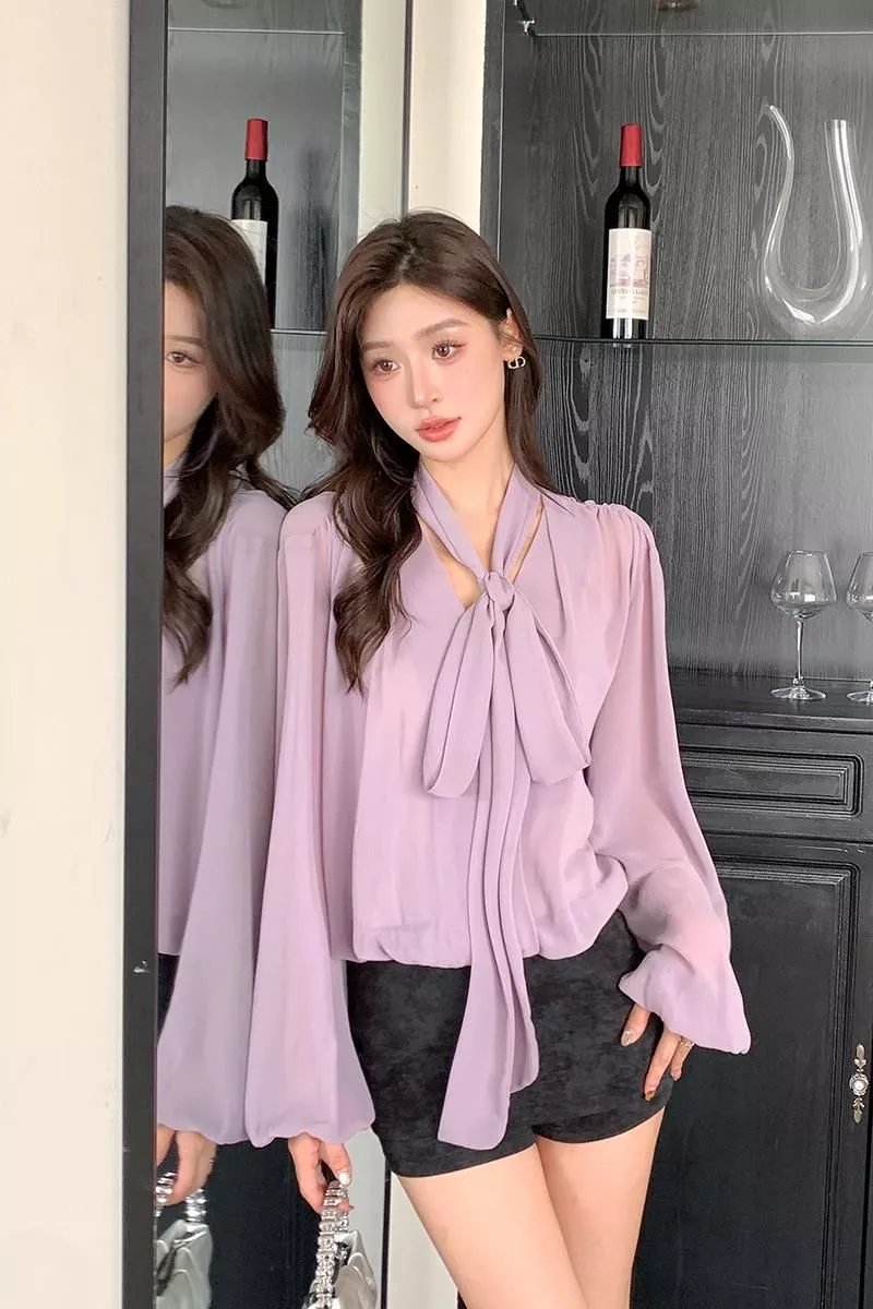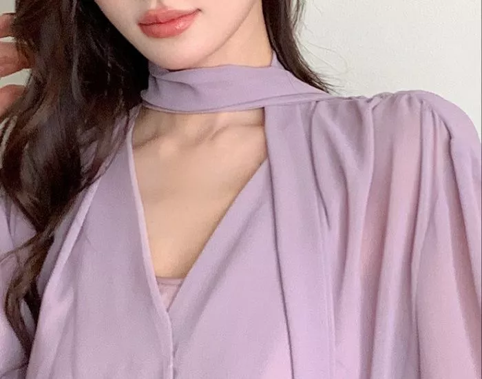Camicia Maglia Blusa Donna Camicetta Viola Raso Slim Maniche 21530
